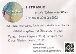 North Art Member Minu exhibits at Seven Artspace with her show Intrigue from 27th November to 30th December Her exhibition includes Abstracts, Landscapes, florals, and portraits in alcohol inks.