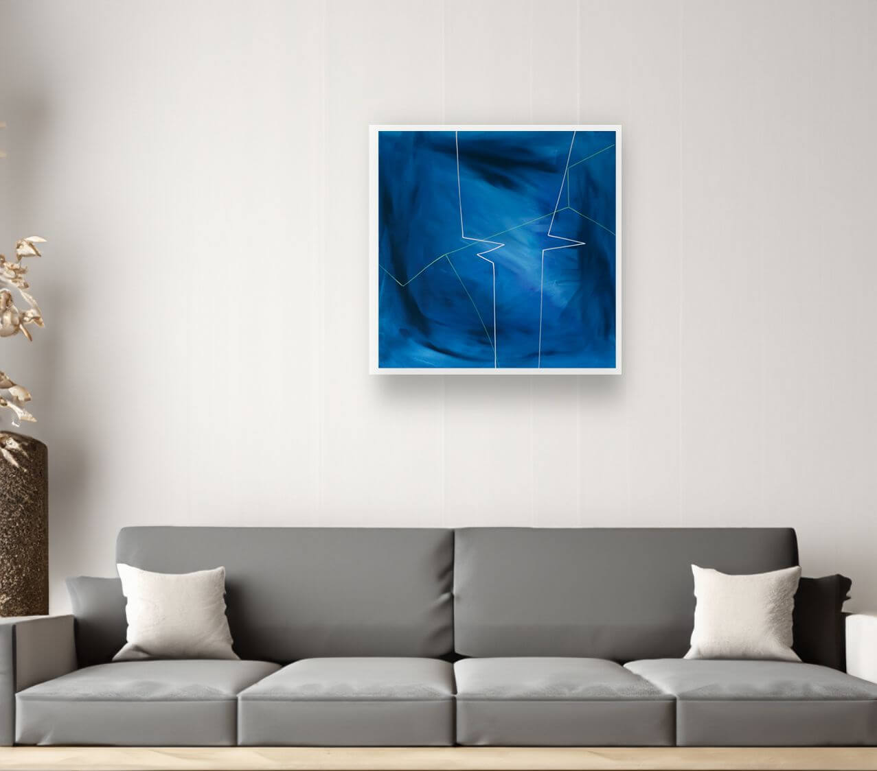 On the one hand, the blurry effect of the background and the use of different nuances of light and dark blue create a soft movement on the canvas a sense of calm in the viewer.