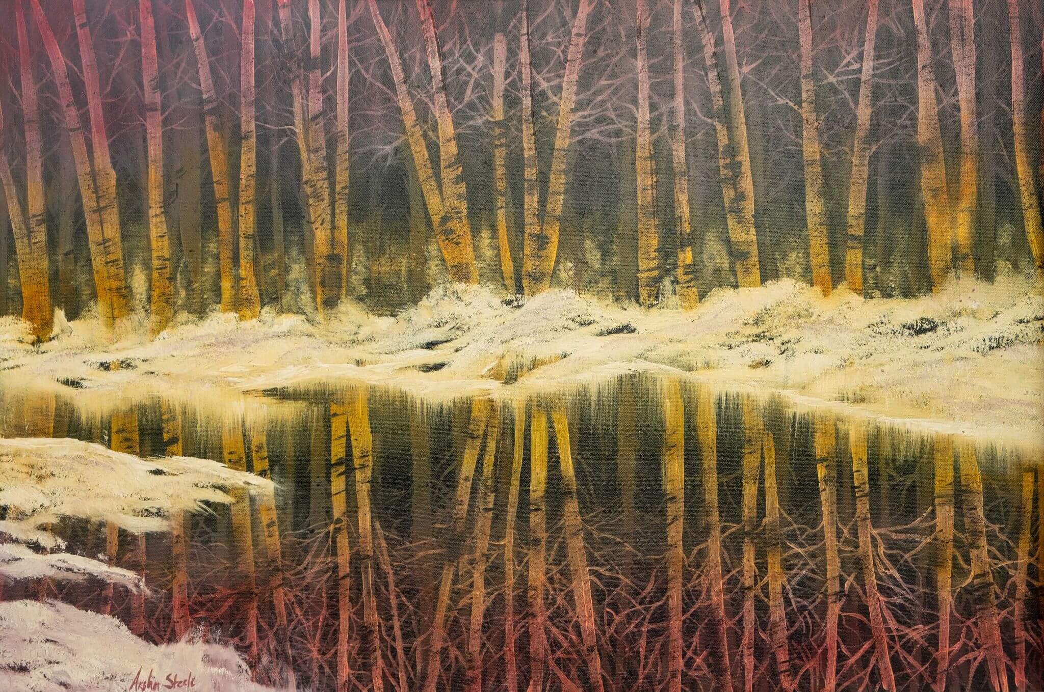 Beautiful landscape oil reflection, depicting winter evening setting.