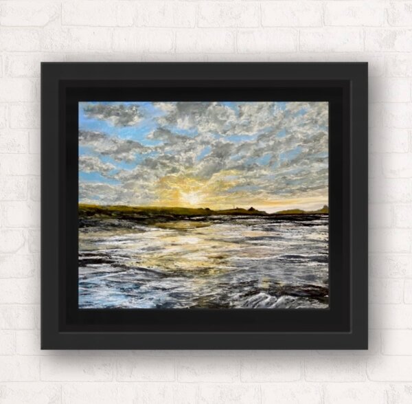 This is the first in a series of three paintings tracking the sunset at Bamburgh. Painted with archival Unison Pastels on Uart Archival textured paper. Supplied in a standard black frame, with archival mount and backing board.
