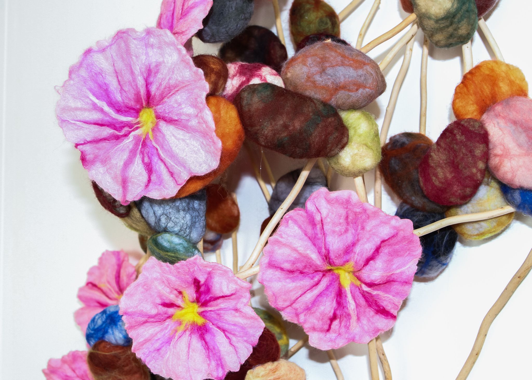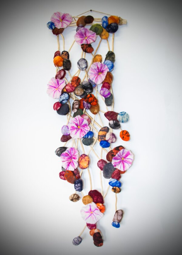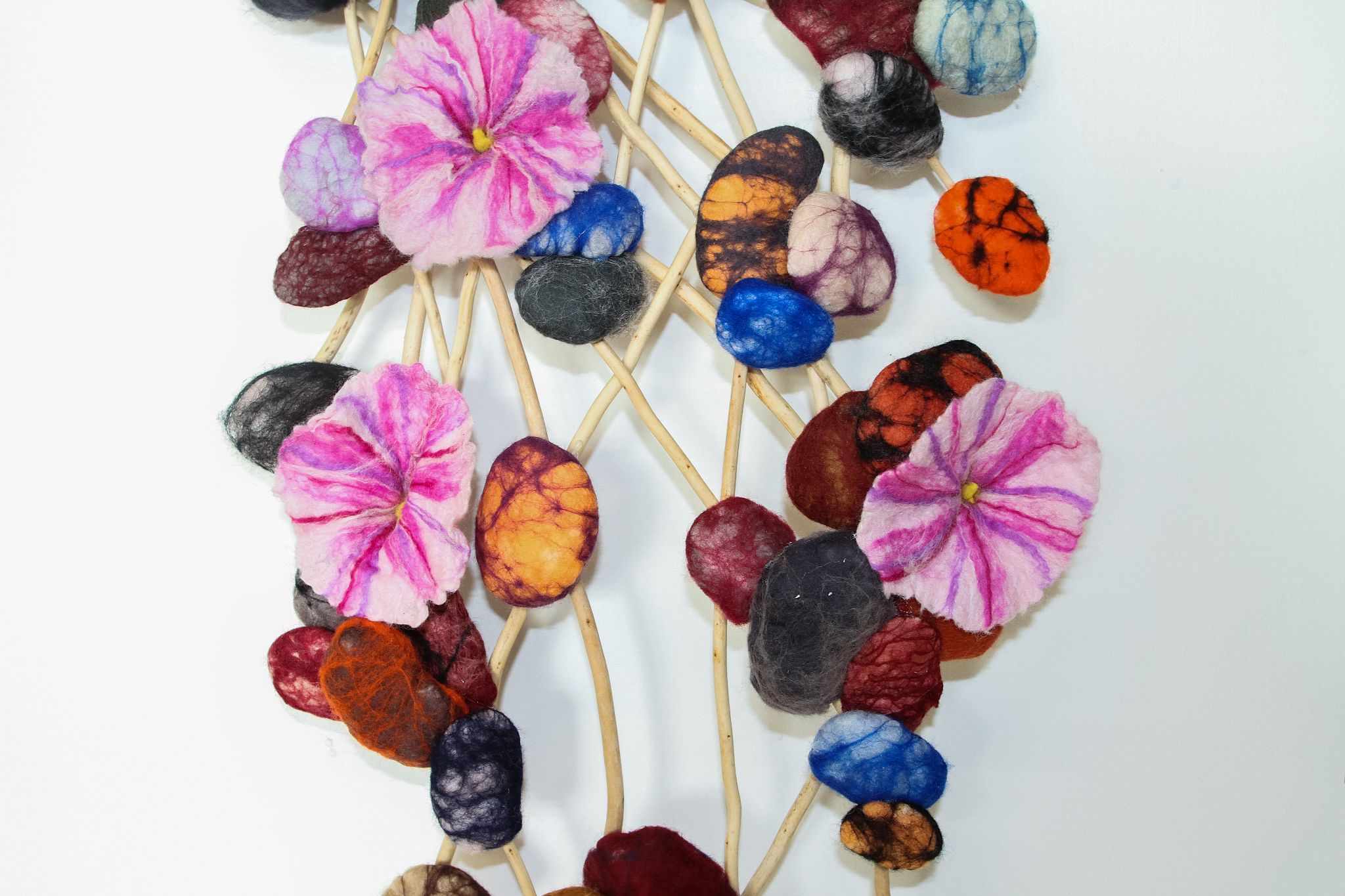 A deconstructed look at the shoreline. The felted sea flowers are breaking through felt stones and driftwood creating abstract sculpture.