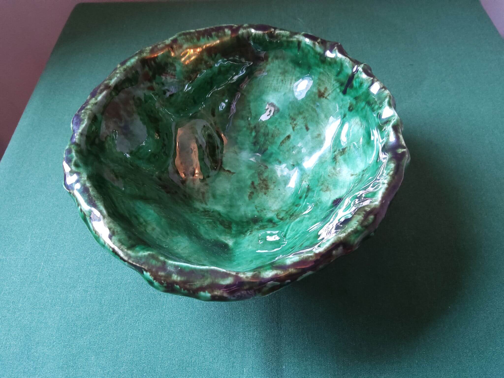 This small bowl was first created as a true hemisphere with a hand pinched rim and tripod base, then “crumpled” to create facets that catch light from multiple angles. The bowl is glazed in multiple layers of different greens and fired to 1140degC to produce a highly reflective finish accenting the deliberately uneven features. Note this bowl is not suitable for food use.