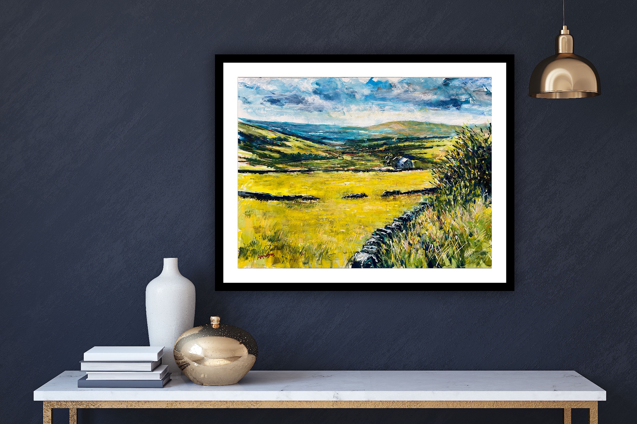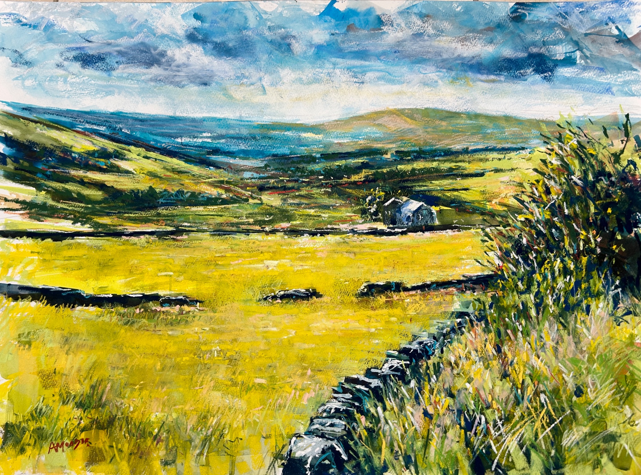 This is a favourite view of mine in the Yorkshire Dales, on the road to Appletreewick. A beautiful view down the valley with a wonderful old barn to provide a focal point and of course with dry stone walls from another age. This was painted using washes of acrylic inks to form an expressive underpainting on which soft pastel was then applied.