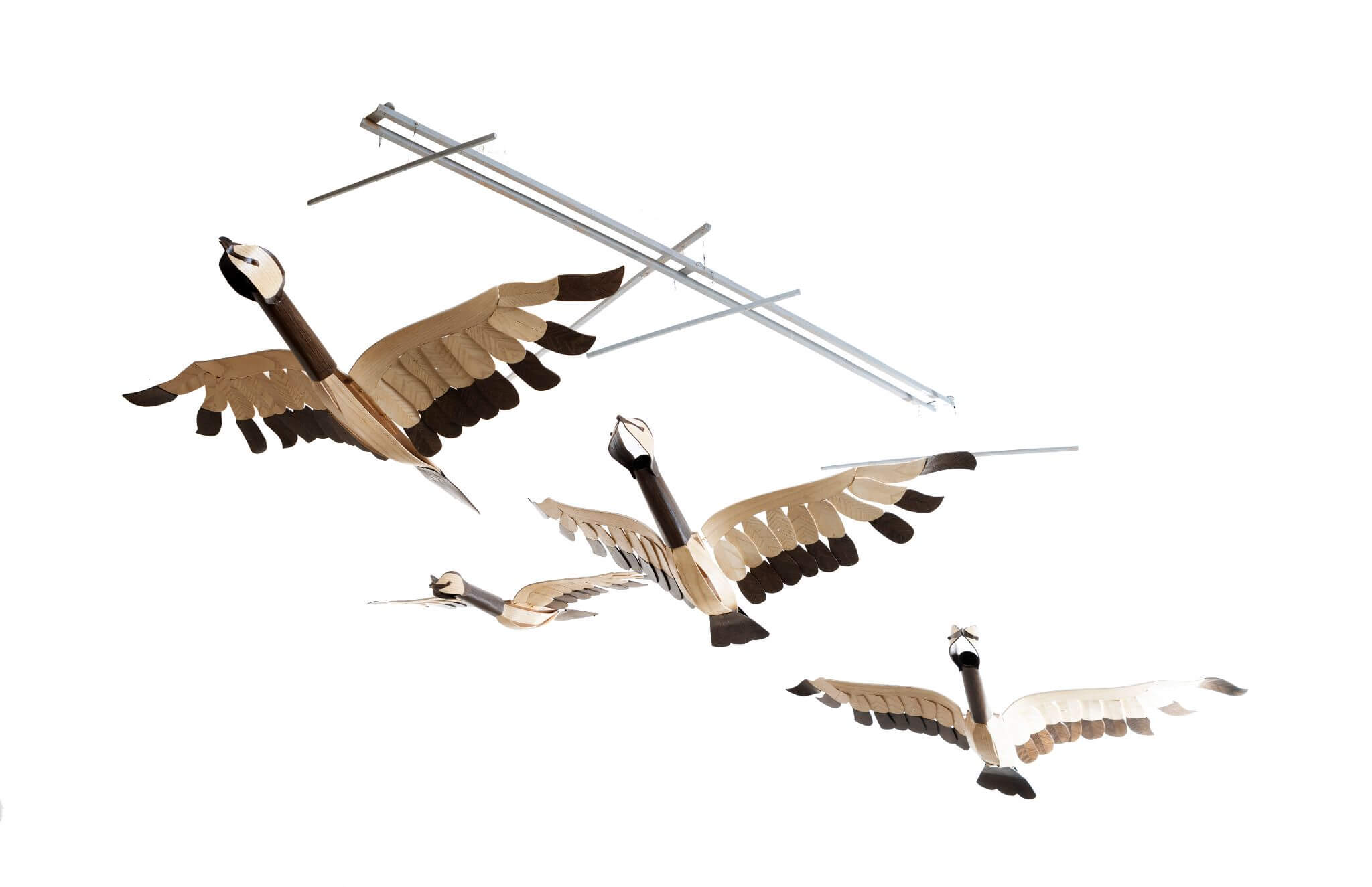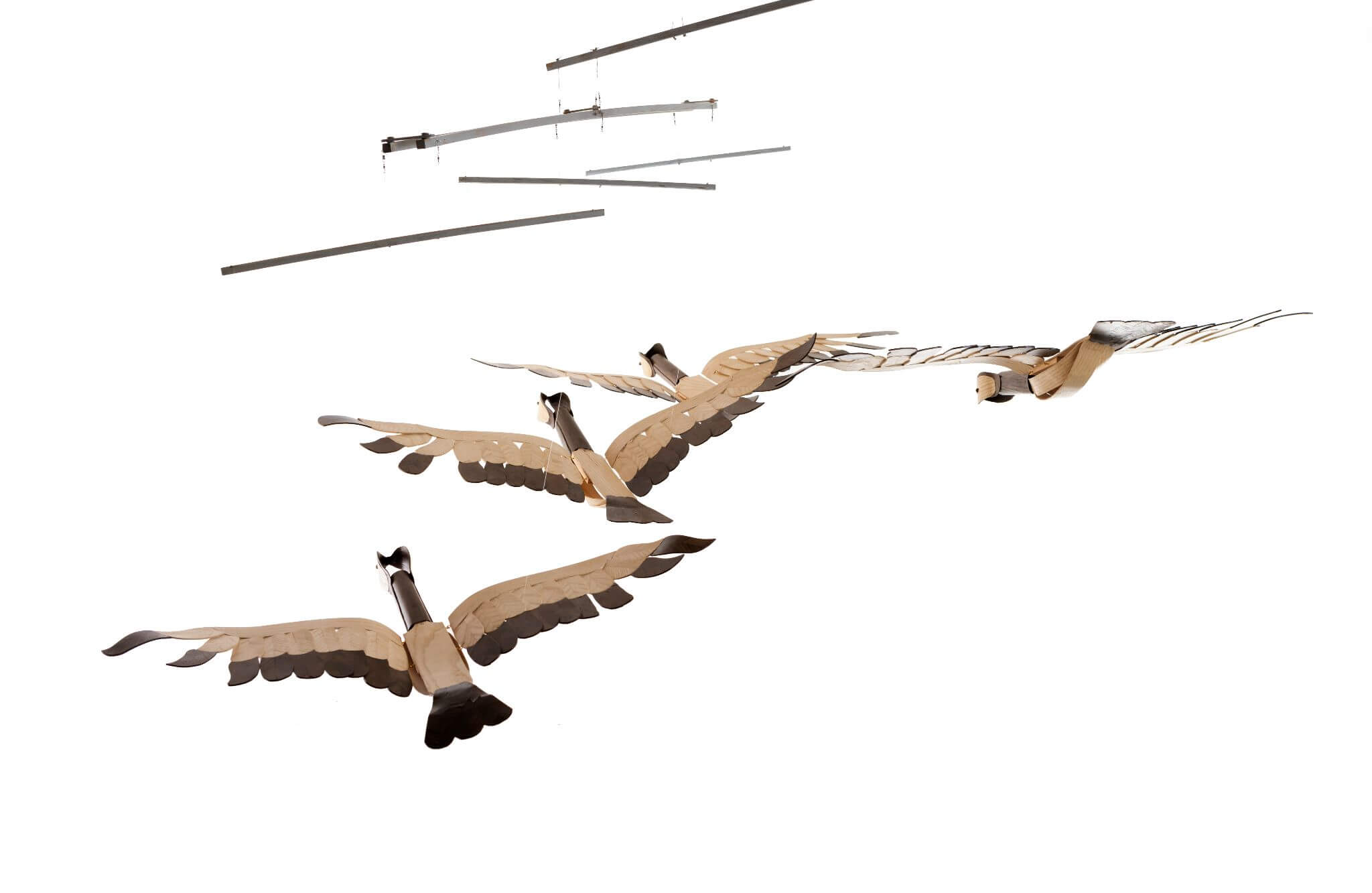 The geese are constructed using laminated Smoked Oak and Ash veneers. The geese are suspended from limed oak beams which allow them to move in relation to each other as well as up and down. An element of user interaction is possible, enabling the flock to “fly” where air currents aren’t producing enough movement.