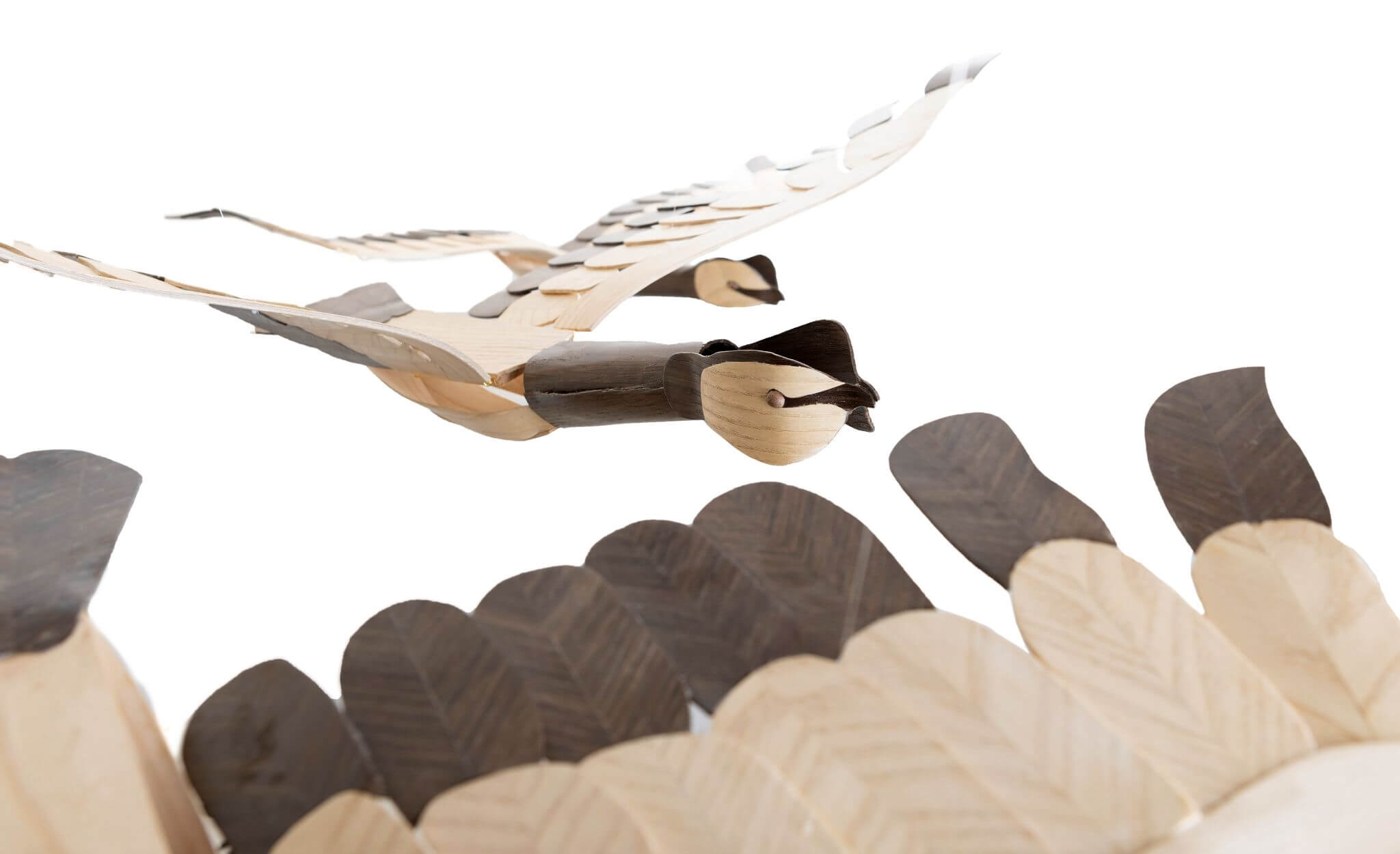 The feathers are constructed using book-matched Ash and Smoked Oak veneers to ensure the effect of feathers. Each feather is constructed and laminated separately, then assembled on to the curved Ash spine of the wing.