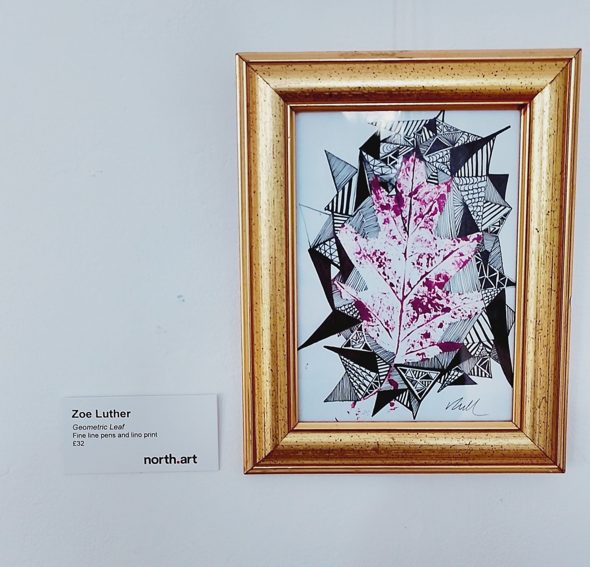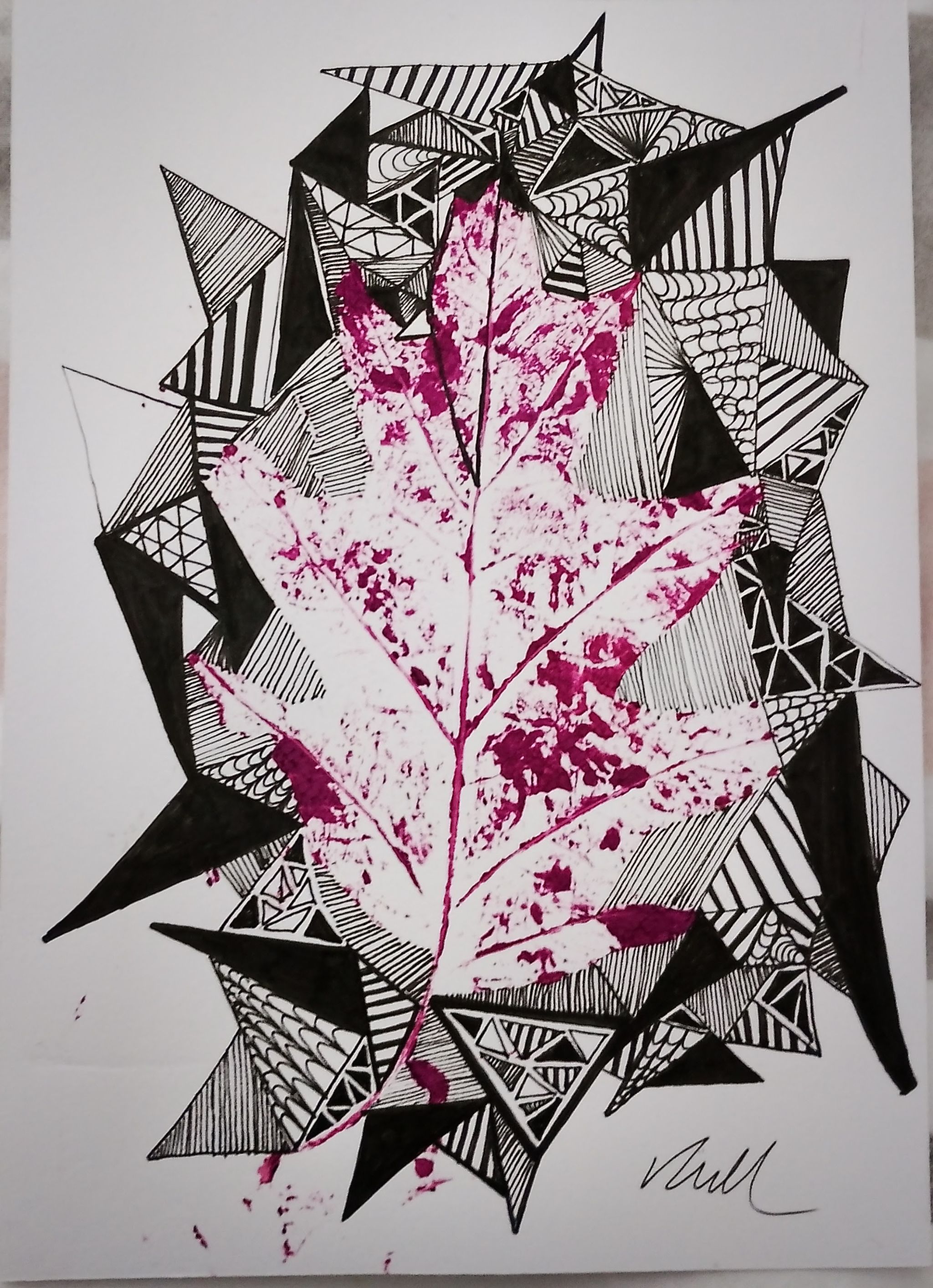 Hand drawn in fine line pens and leaf print made with lino print paint. I have used my unique shading with graphical shapes and lines.