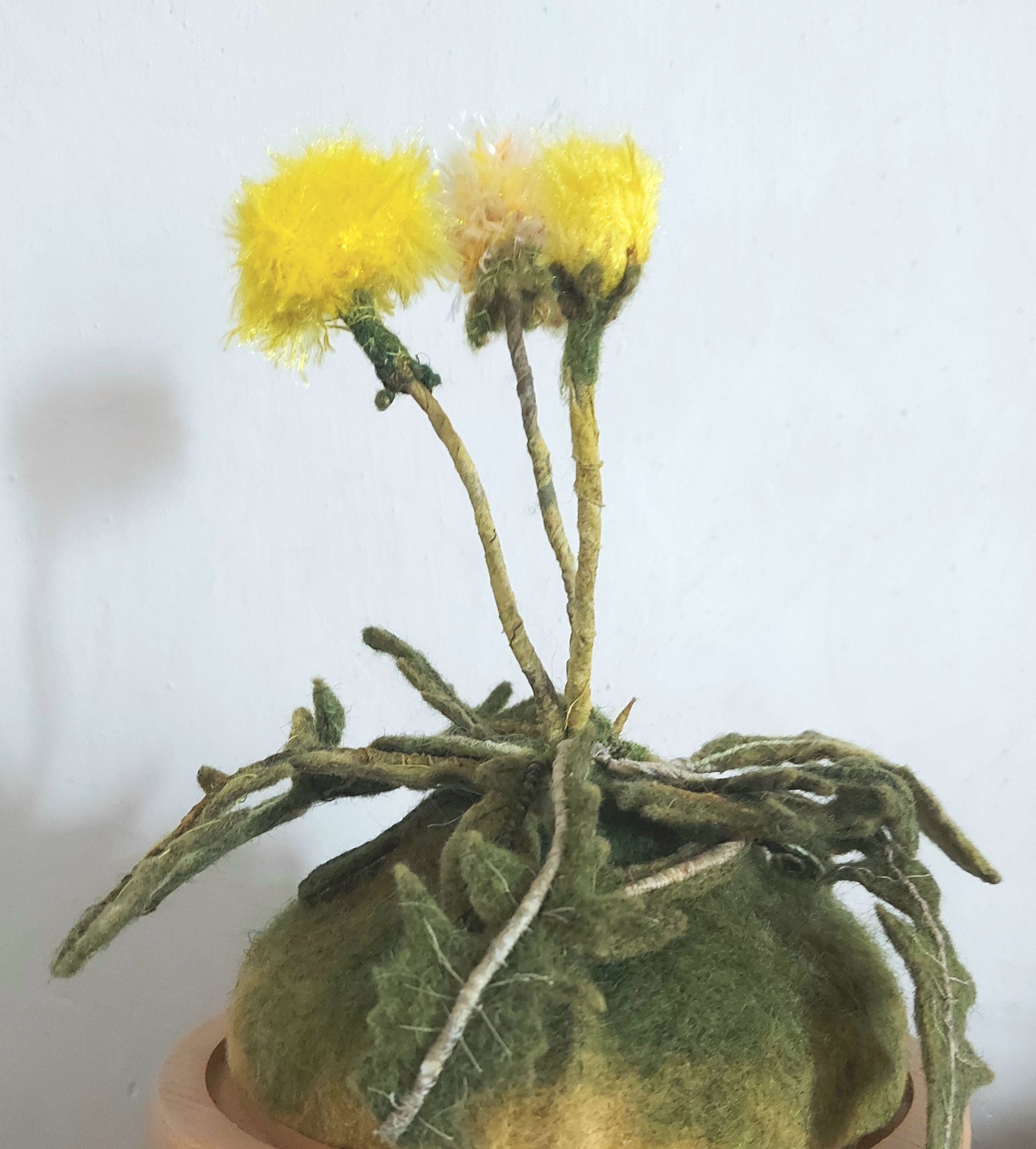 A textile sculpture, housed in a glass dome. Completely hand made using hand dyed plant fibres and wool, all hand stitched.