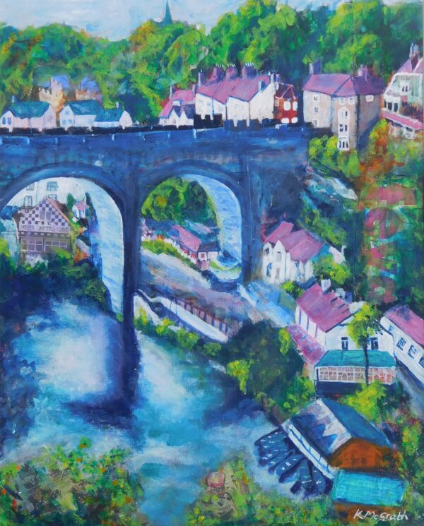 Mixed media painting of Knaresborough Viaduct, mounted and framed in a silver frame.