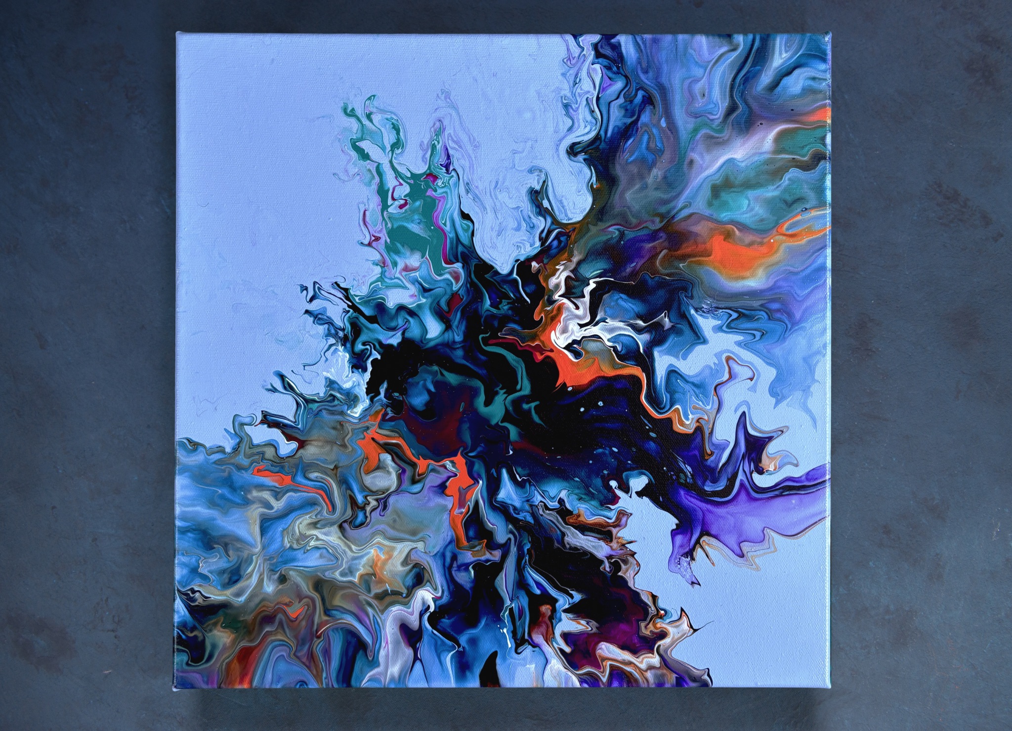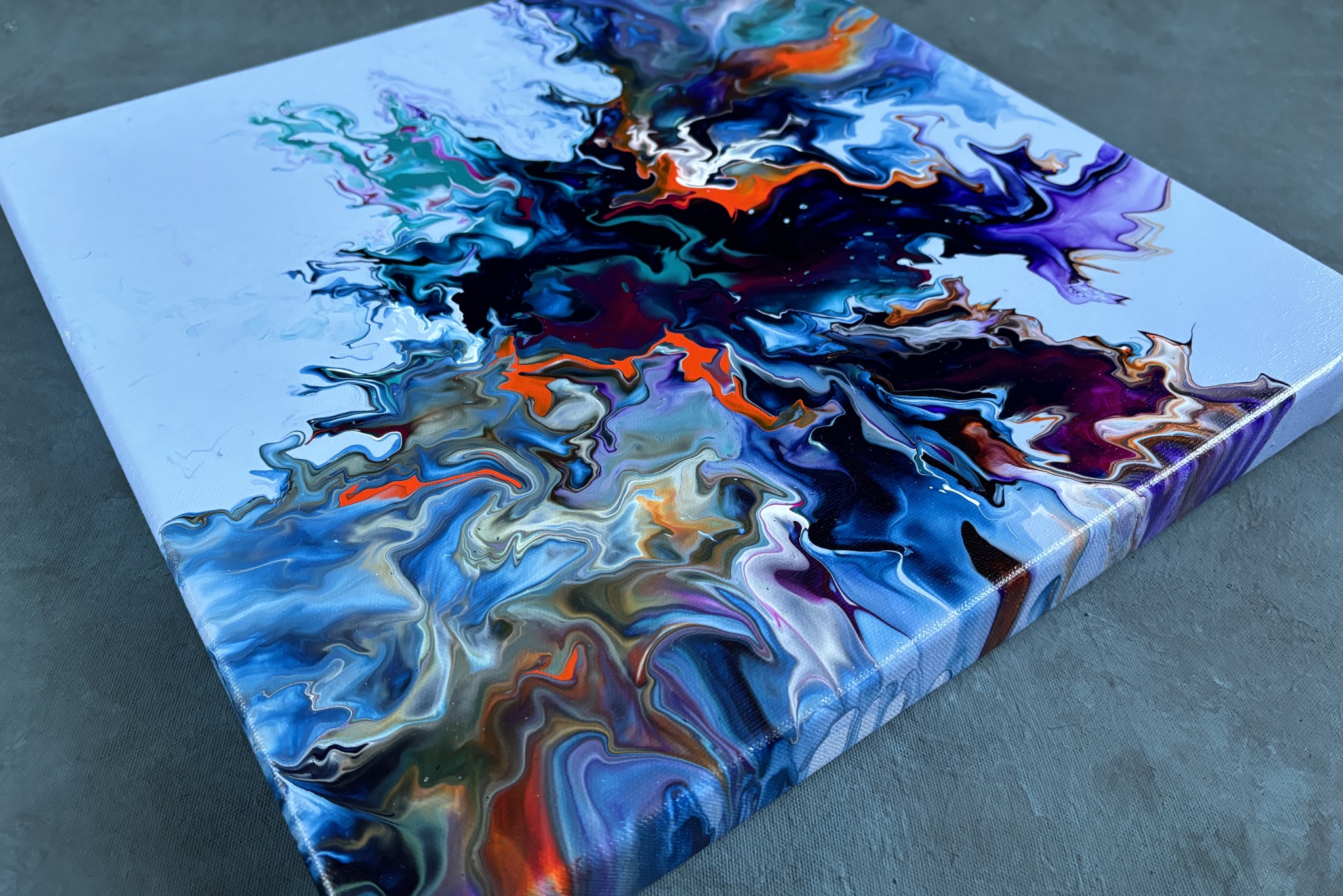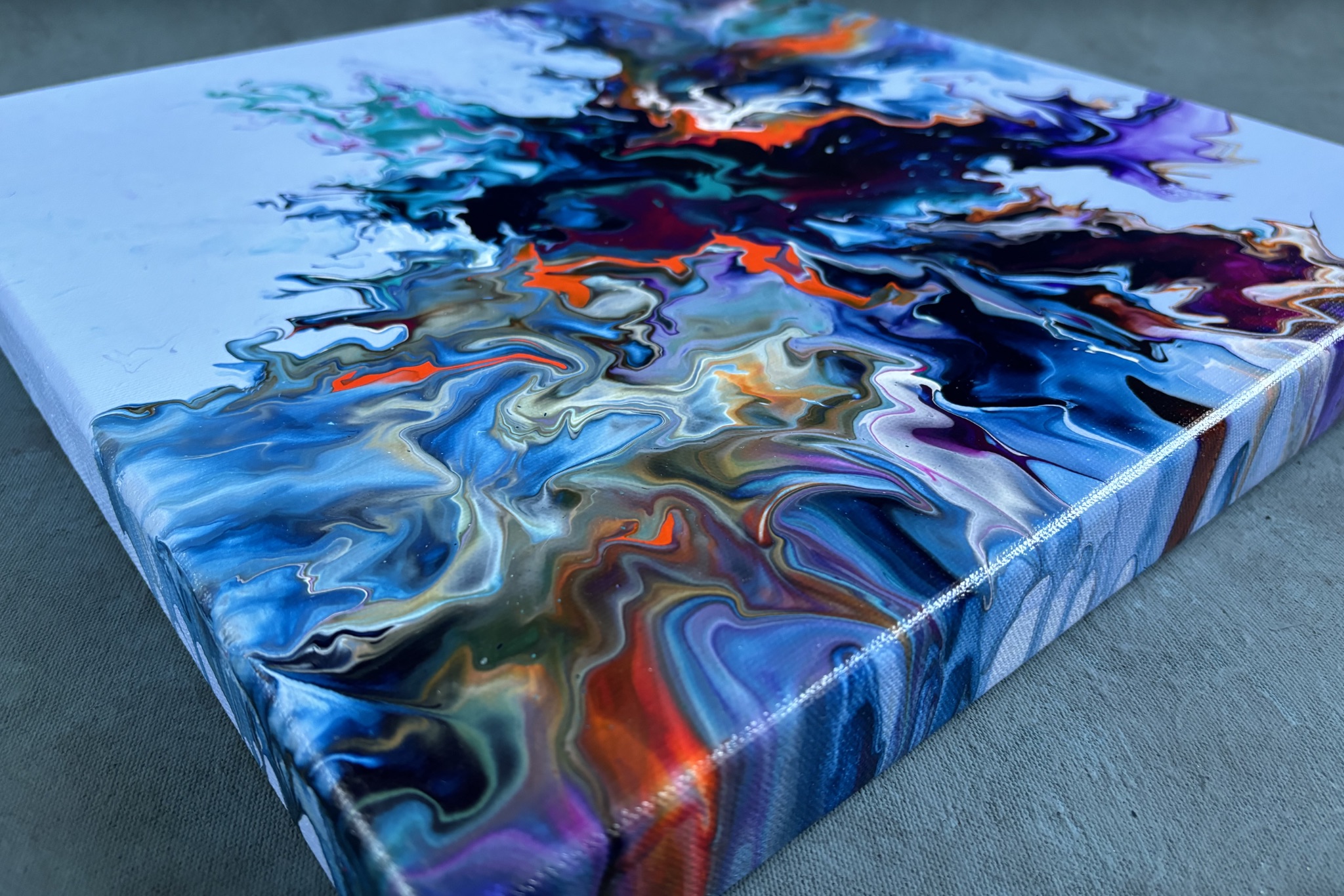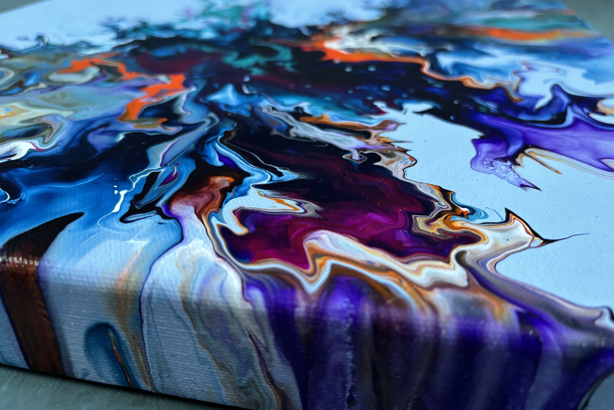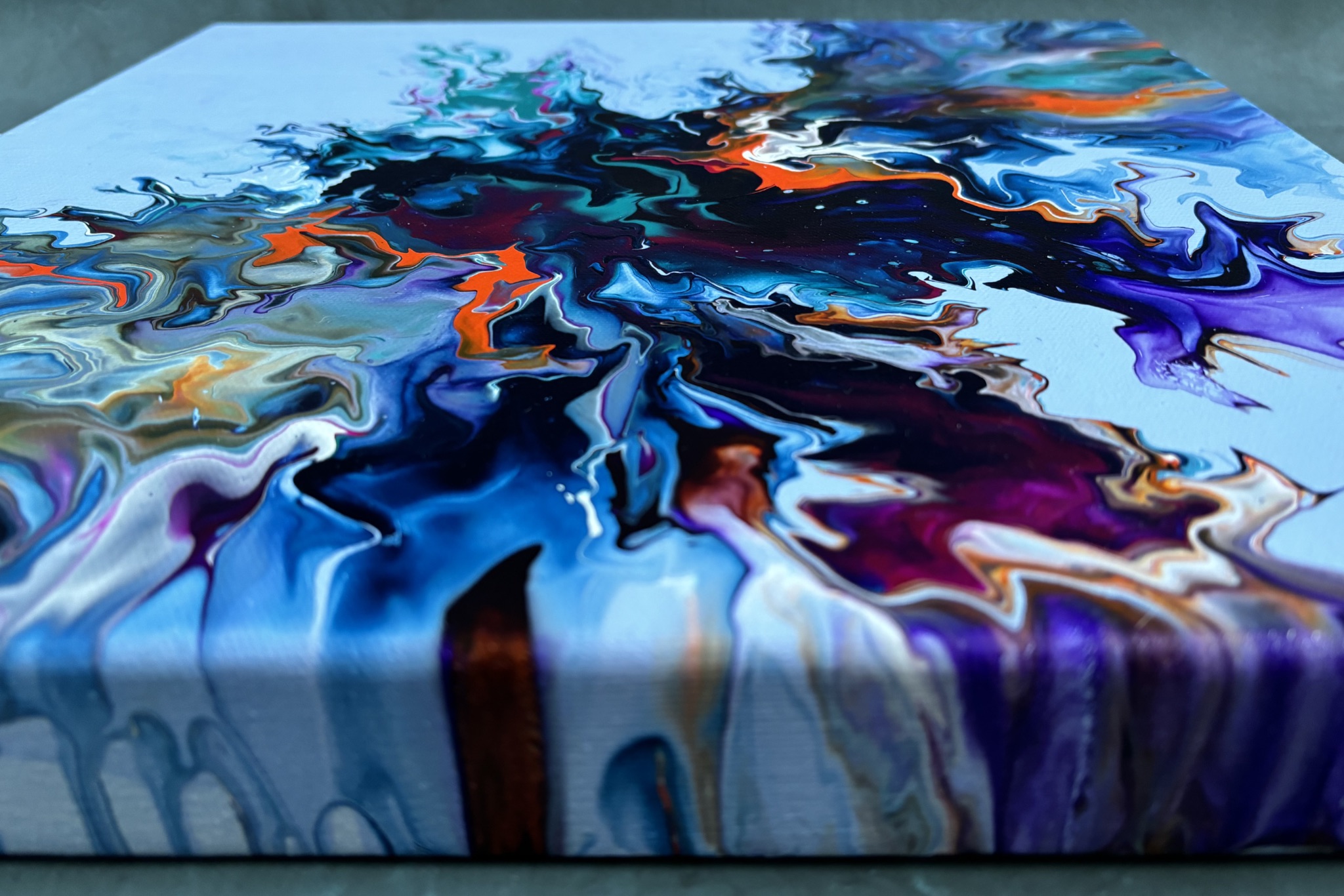 There is such a lot going on in this work. “Making waves” is a beautiful fluid abstract featuring rich blends of Prussian blue, orange and violet, and lots of intricate details.