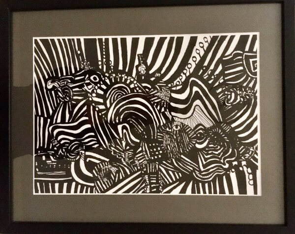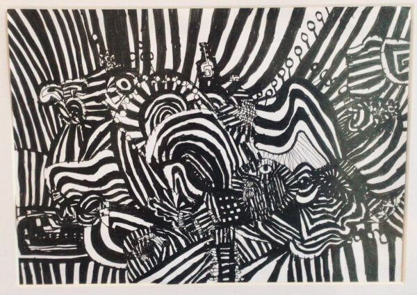 An expressionistic, abstract, monochrome pen drawing straight from the imagination.