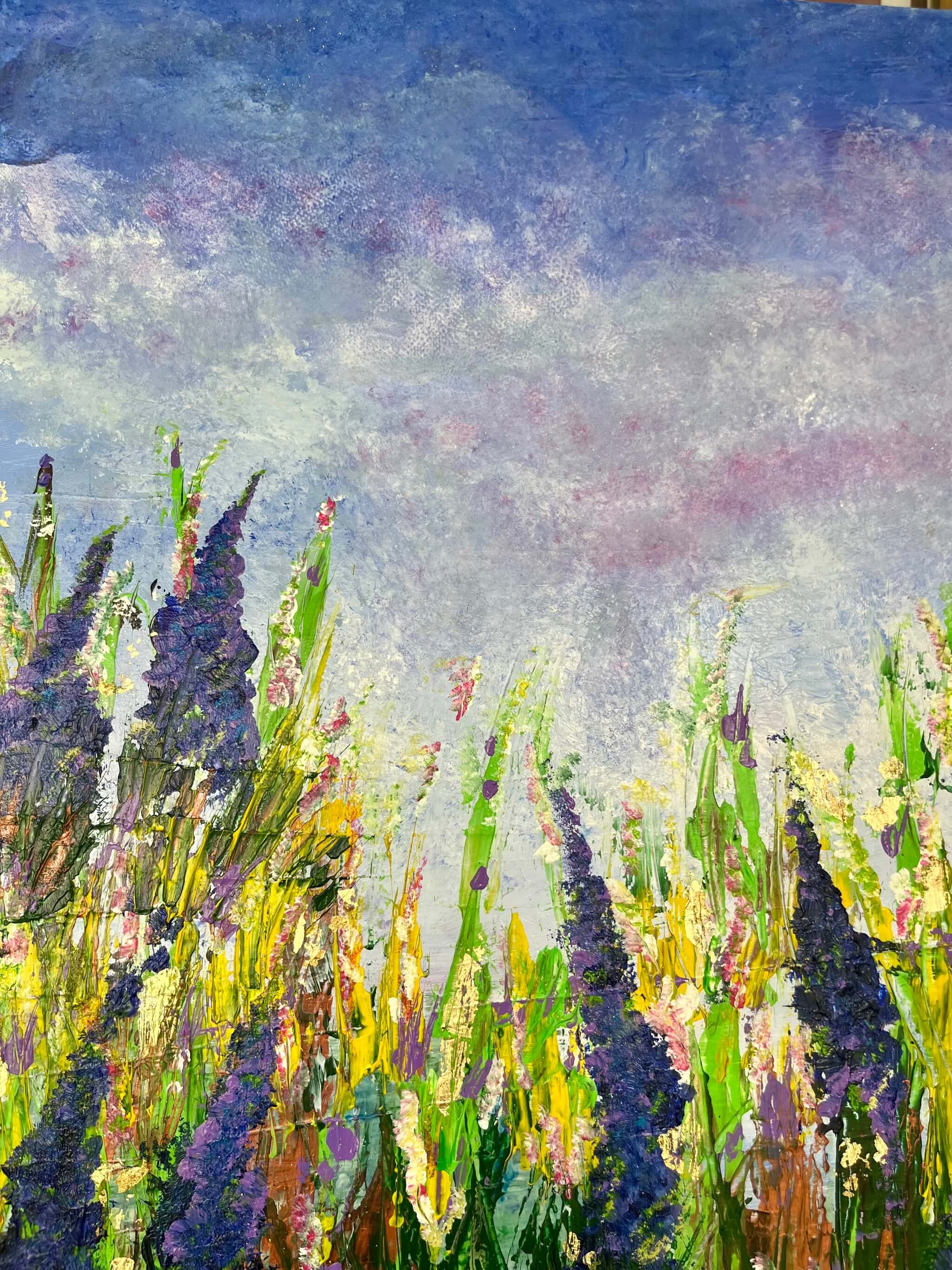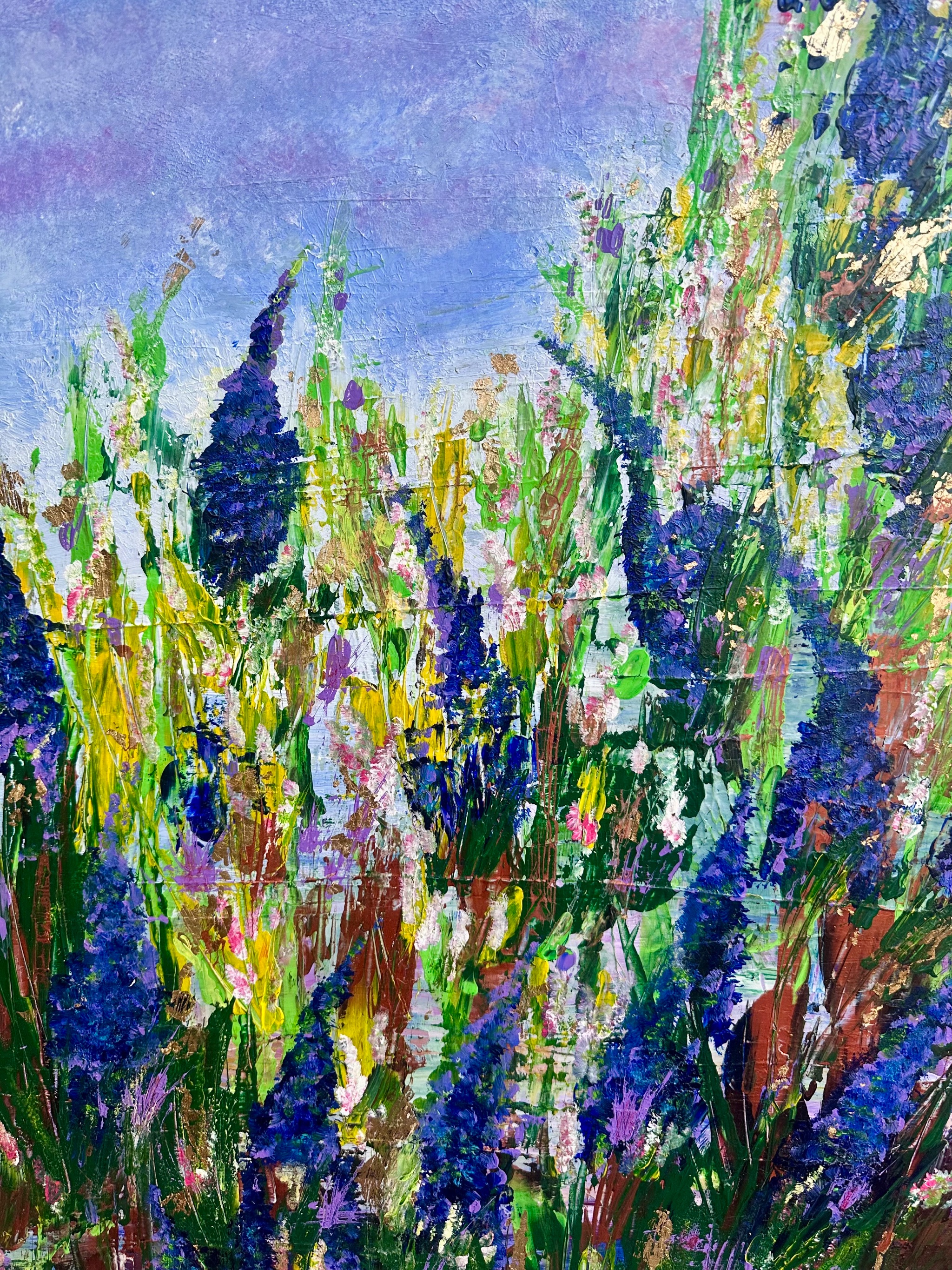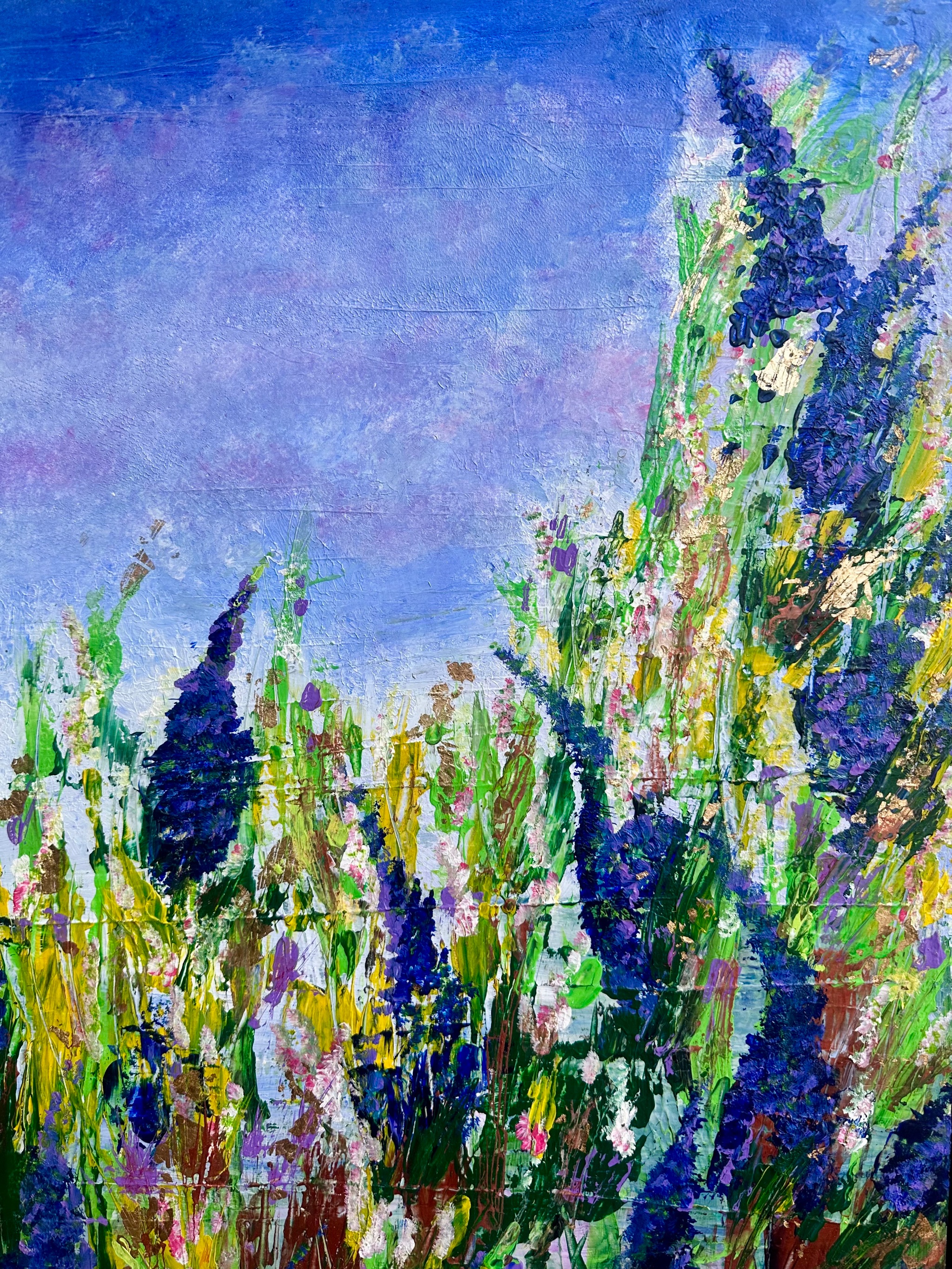Beautiful blue and lilac flowers against a Wedgwood and Ultramarine blue sky. this painting is on wood and has lots of texture. It is embellished with gold leaf and a sprinkle of shimmer dust. It has 3 coats of satin varnish and is strung ready to hang. The artwork comes with a certificate of authenticity.