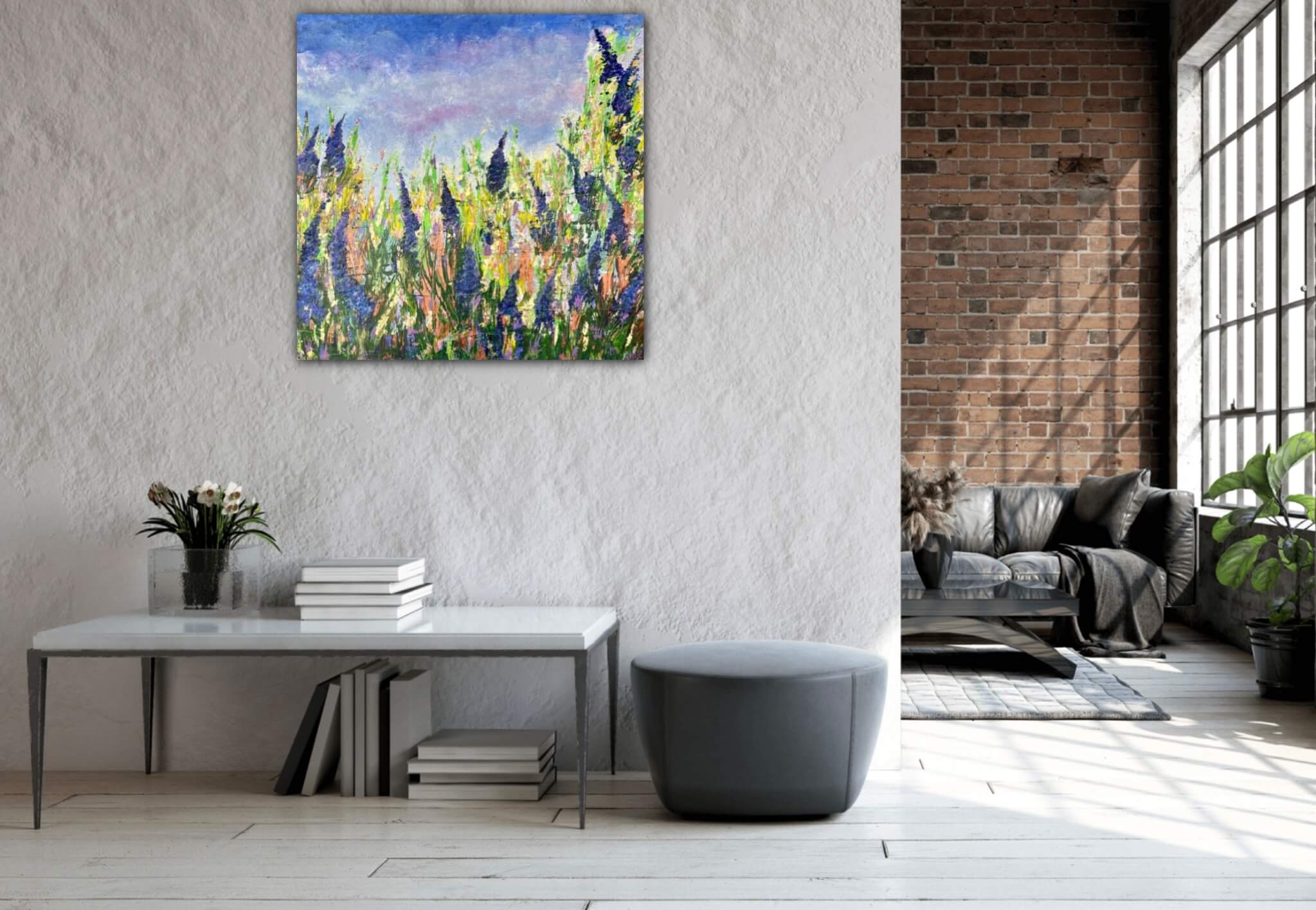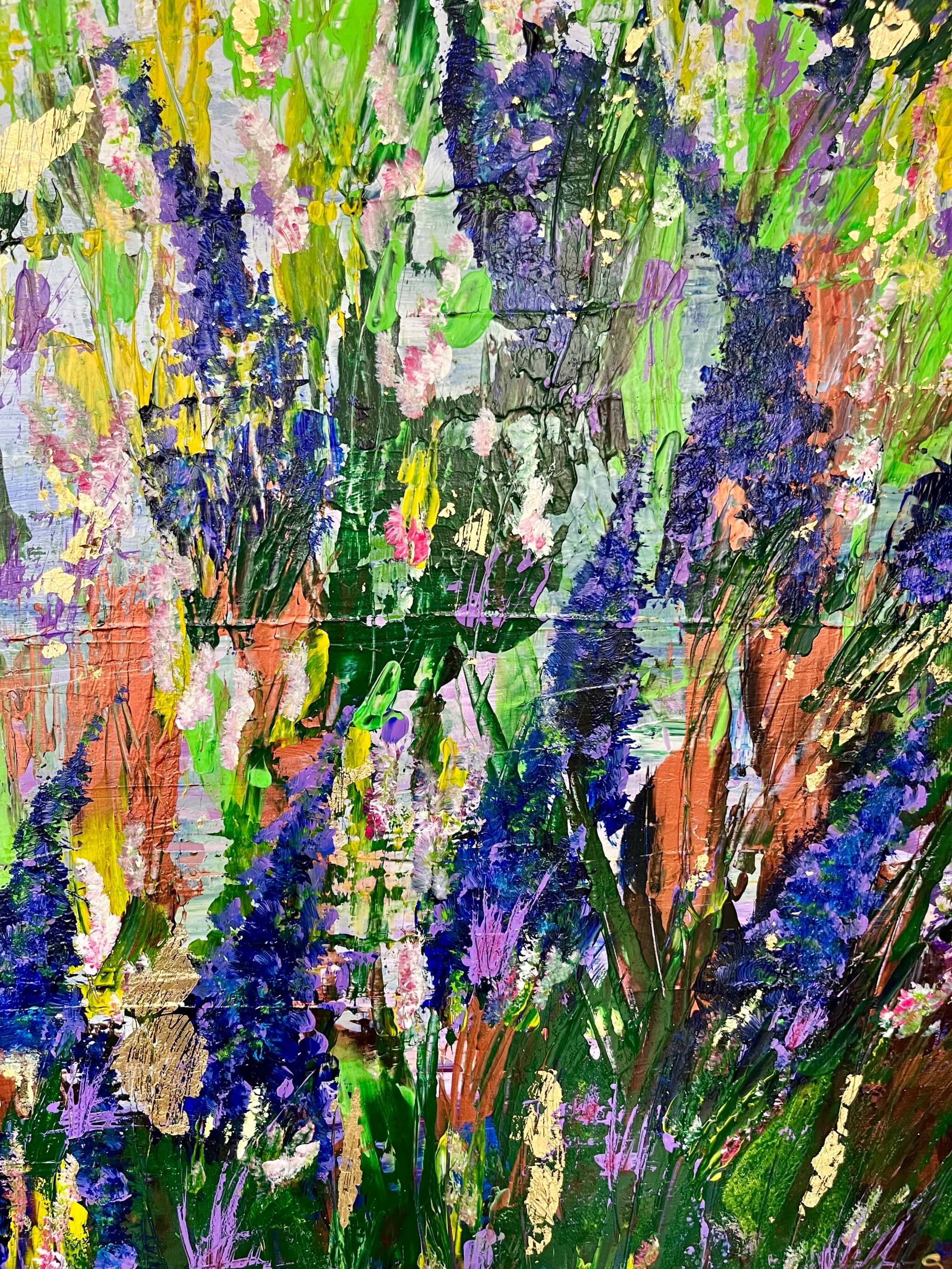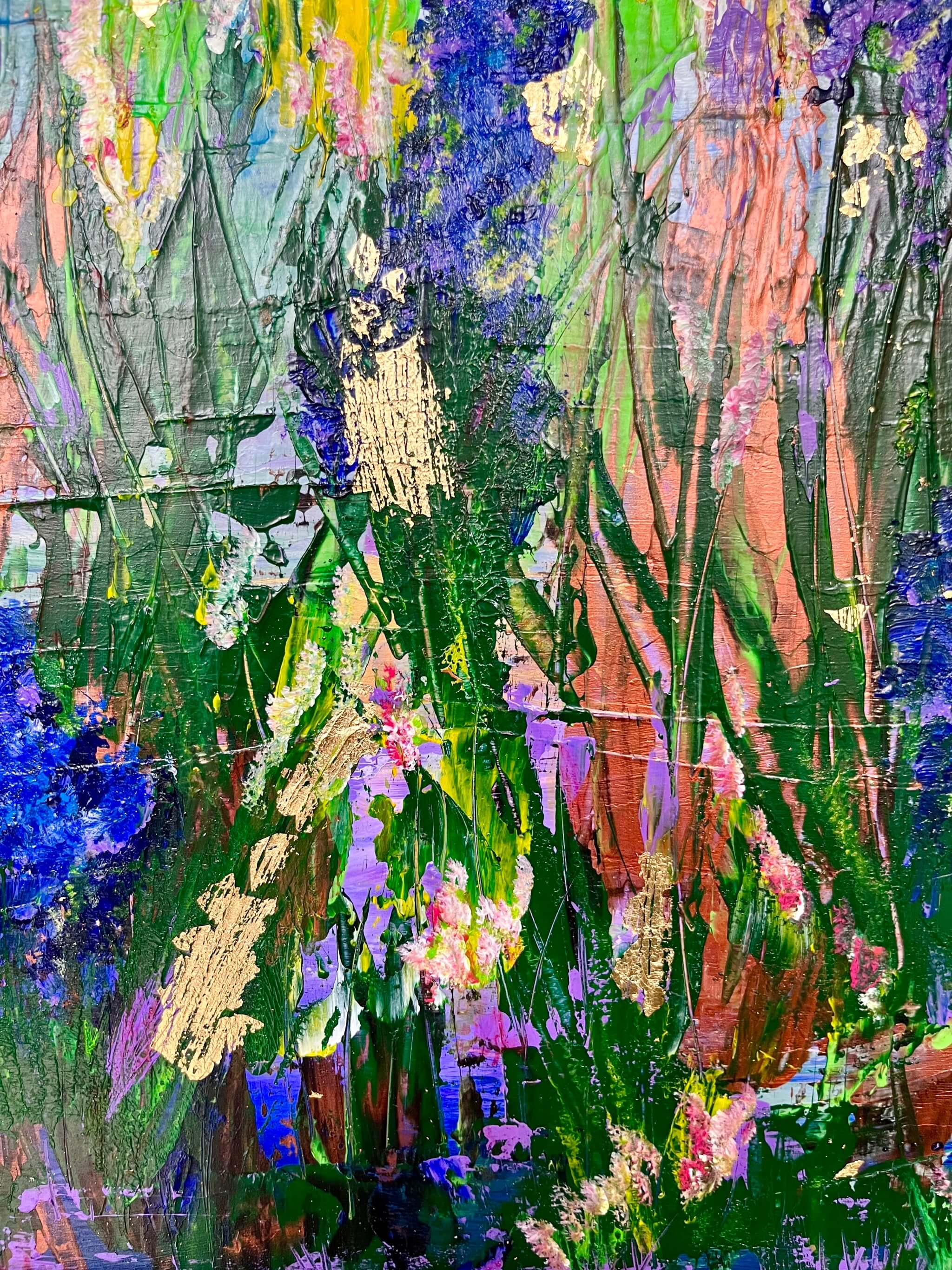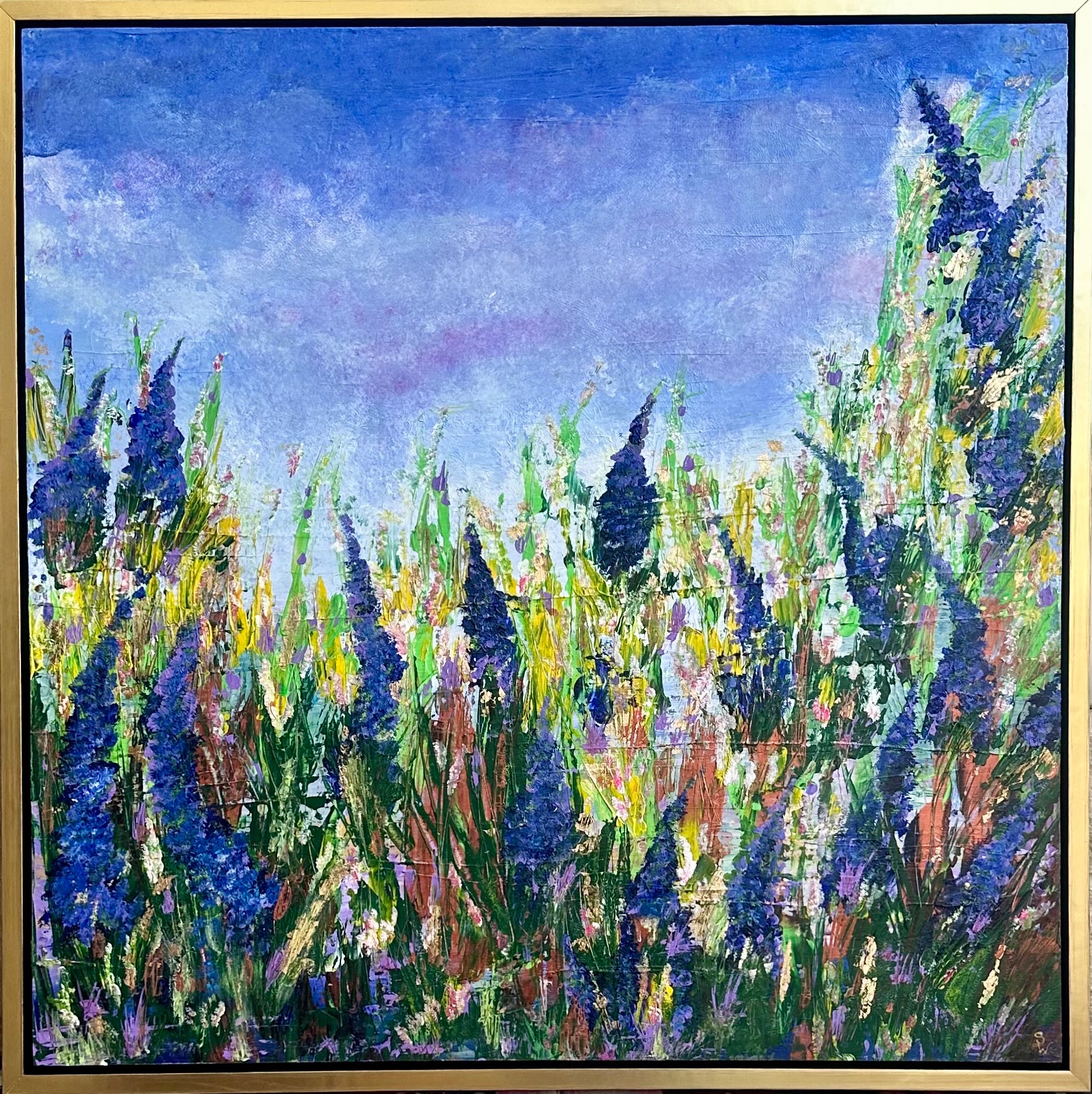 Beautiful blue and lilac flowers against a Wedgwood and Ultramarine blue sky. this painting is on wood and has lots of texture. It is embellished with gold leaf and a sprinkle of shimmer dust. It has 3 coats of satin varnish and is strung ready to hang. The artwork comes with a certificate of authenticity.