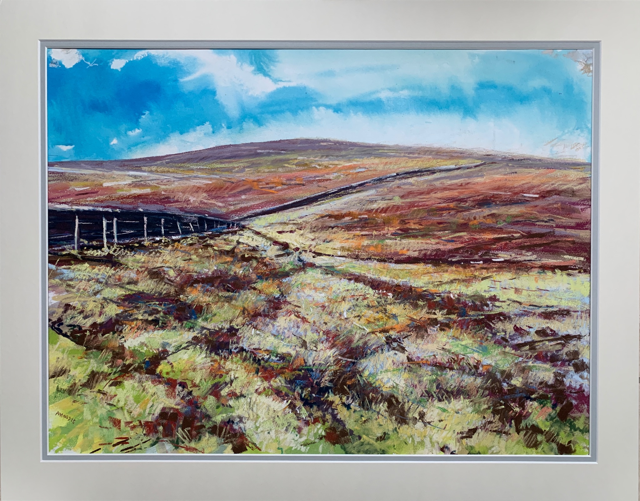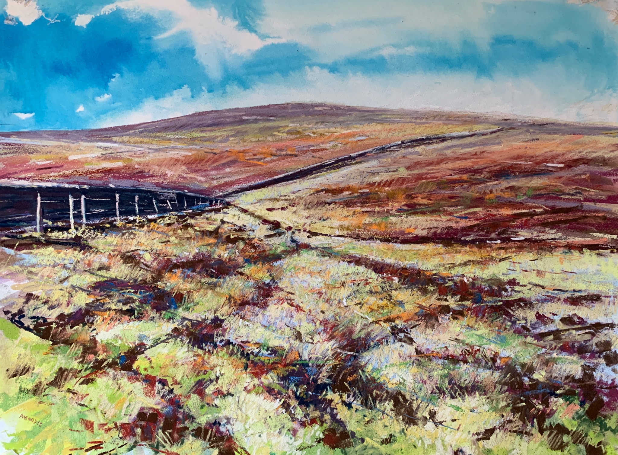 The moors above the North Yorkshire town of Pateley Bridge provide an amazing splash of colour in Spring. This was painted on site using washes of acrylic inks before applying soft pastel.