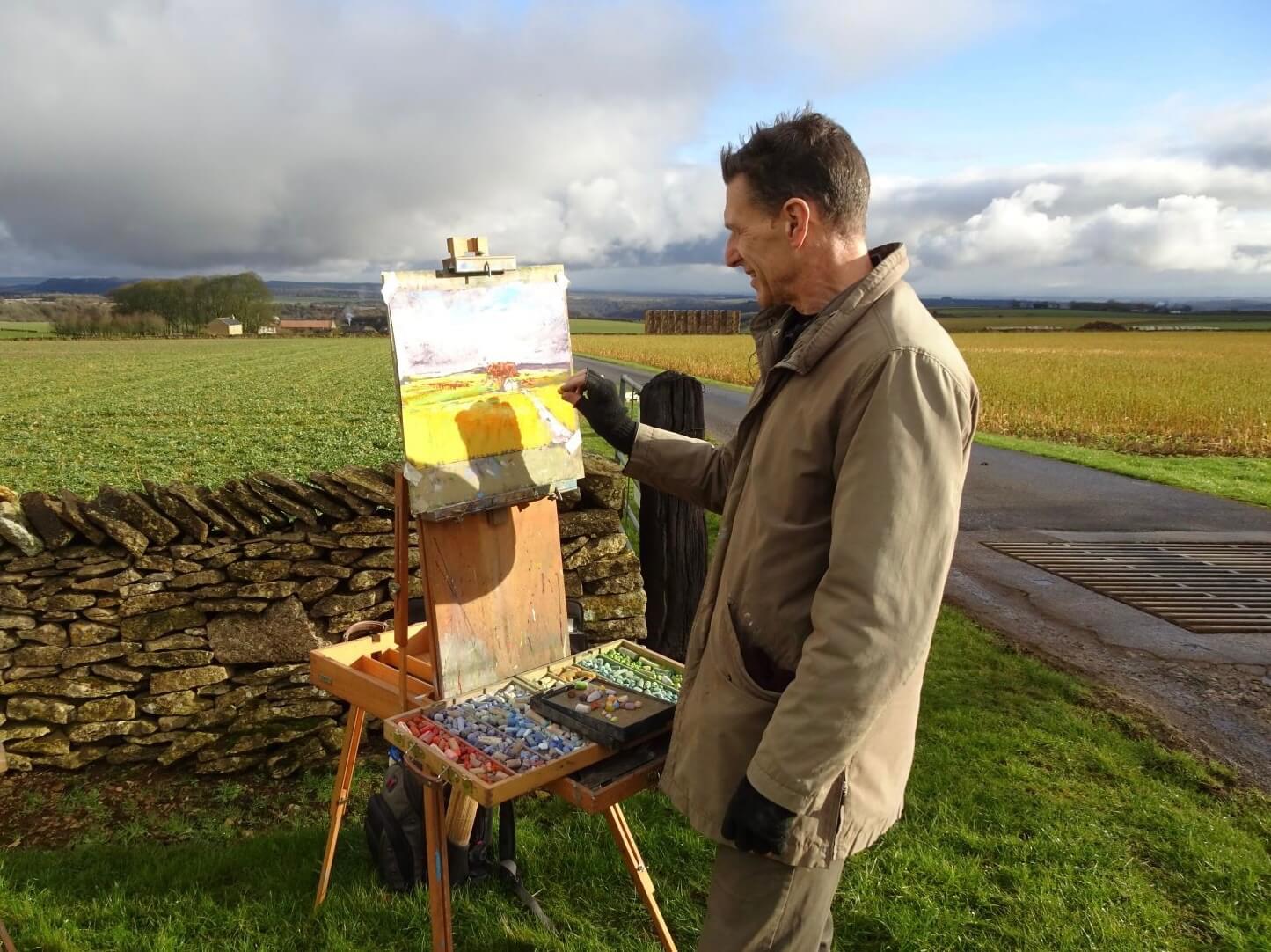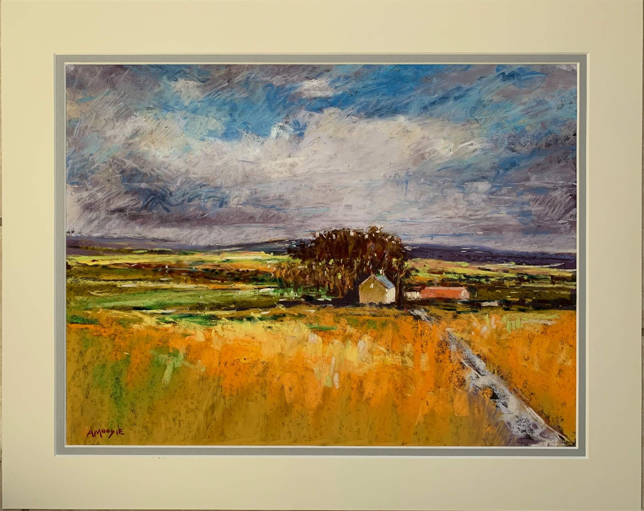 High on the edge of the North York Moors near Sutton Bank, this farmland and its associated buildings made a perfect foil against a magnificent winter’s sky. Painted on site on a cold but wonderfully bright January day.
