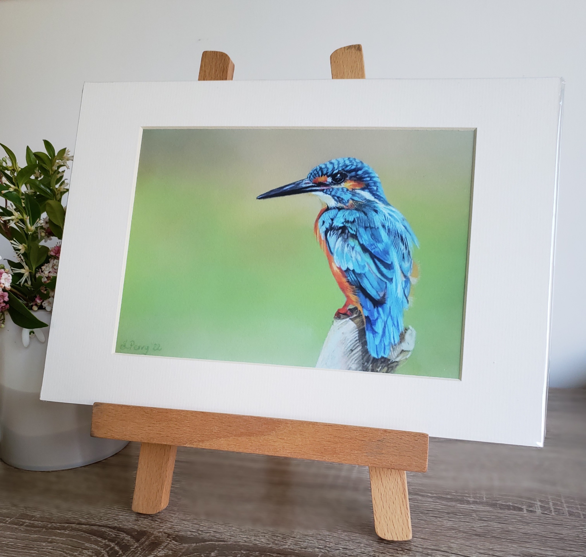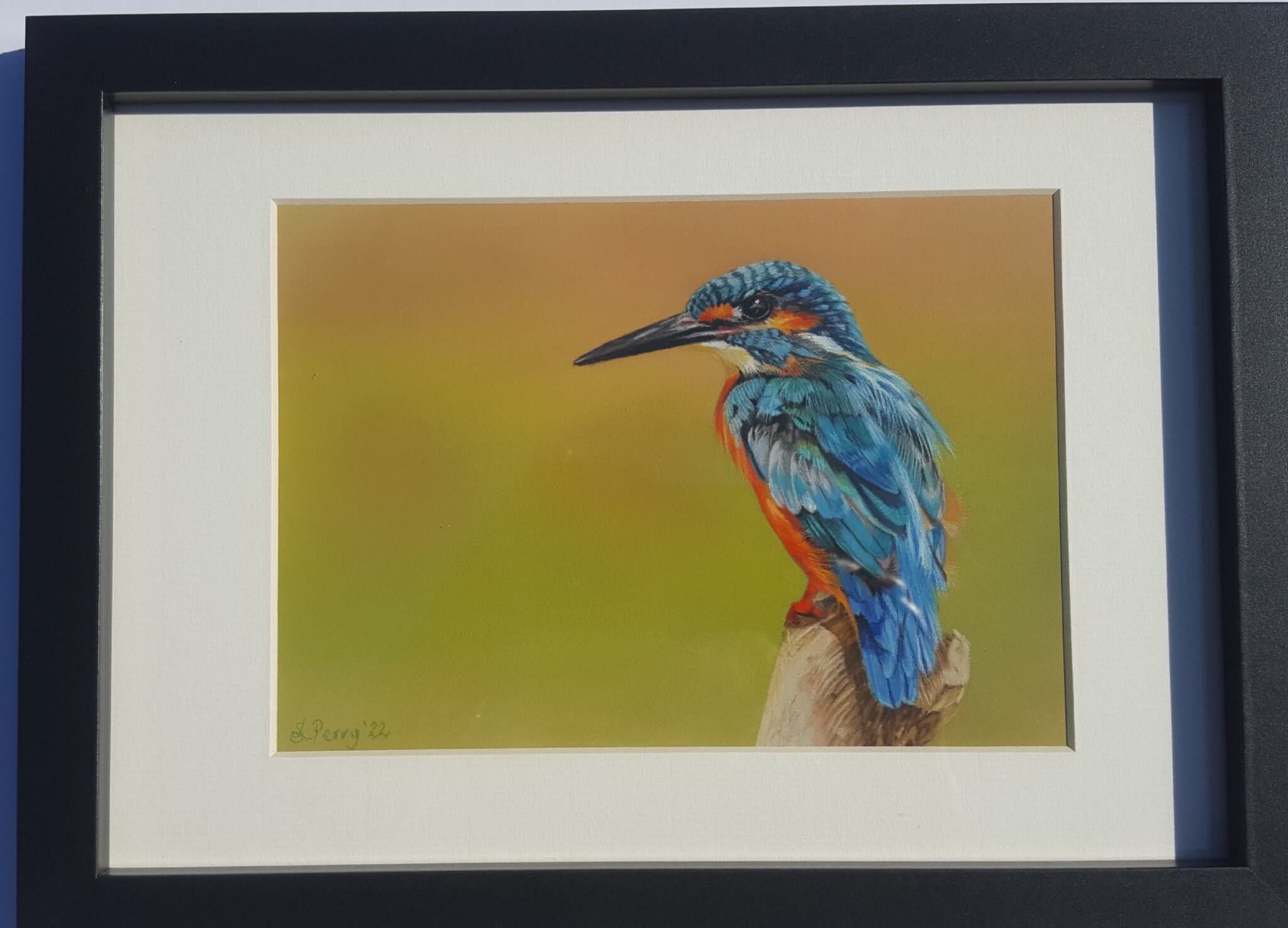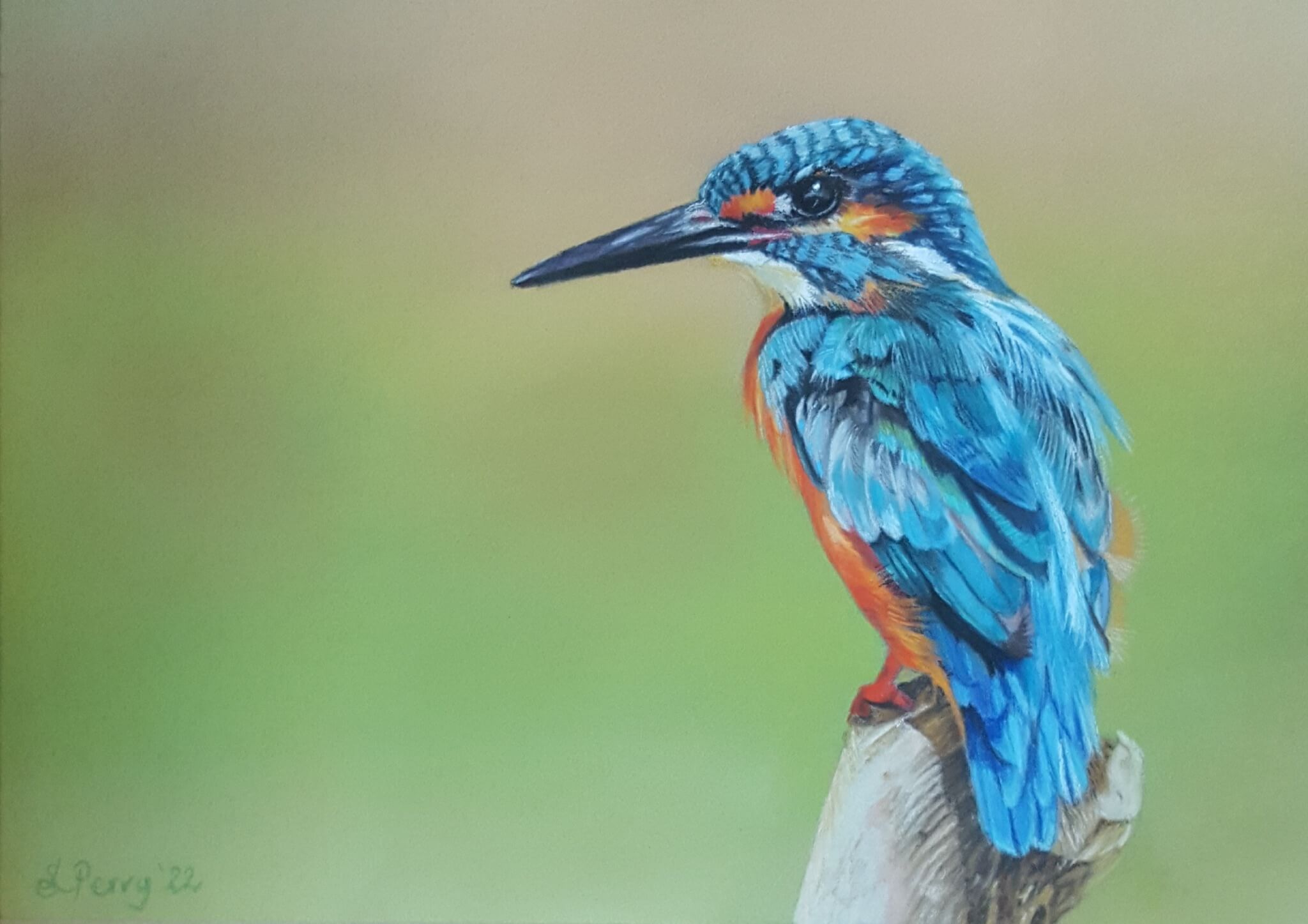 A pastel drawing on Pastelmat of a kingfisher poised, ready to dive into a stream after minnows and sticklebacks.