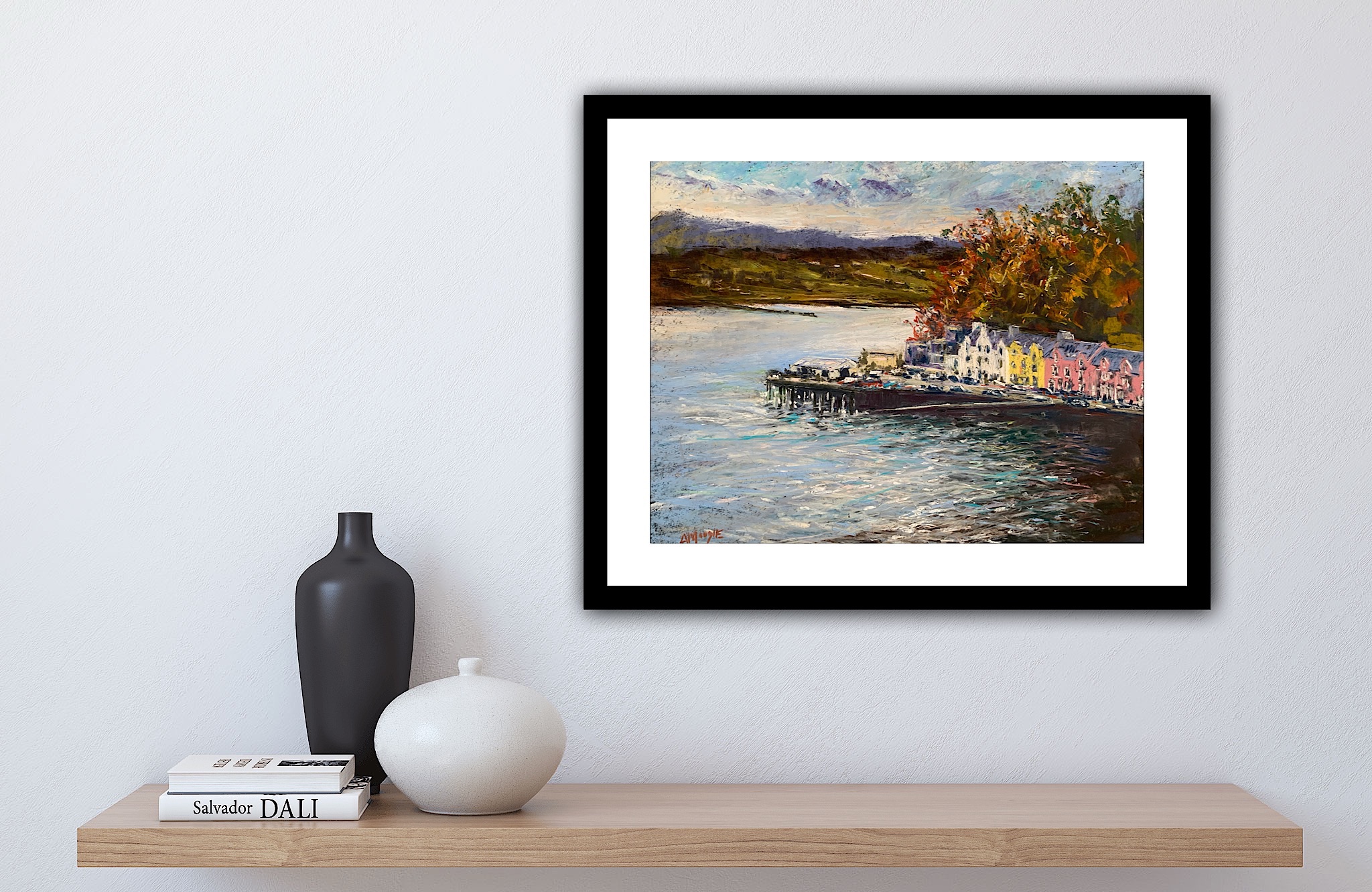 The colourful buildings on the quayside at Portree on the Isle of Skye viewed from above on a drizzly day. Painted on site in October, I managed to avoid the rain just long enough to find the essence of the view before completing it back in the studio when showers stopped me in my tracks!