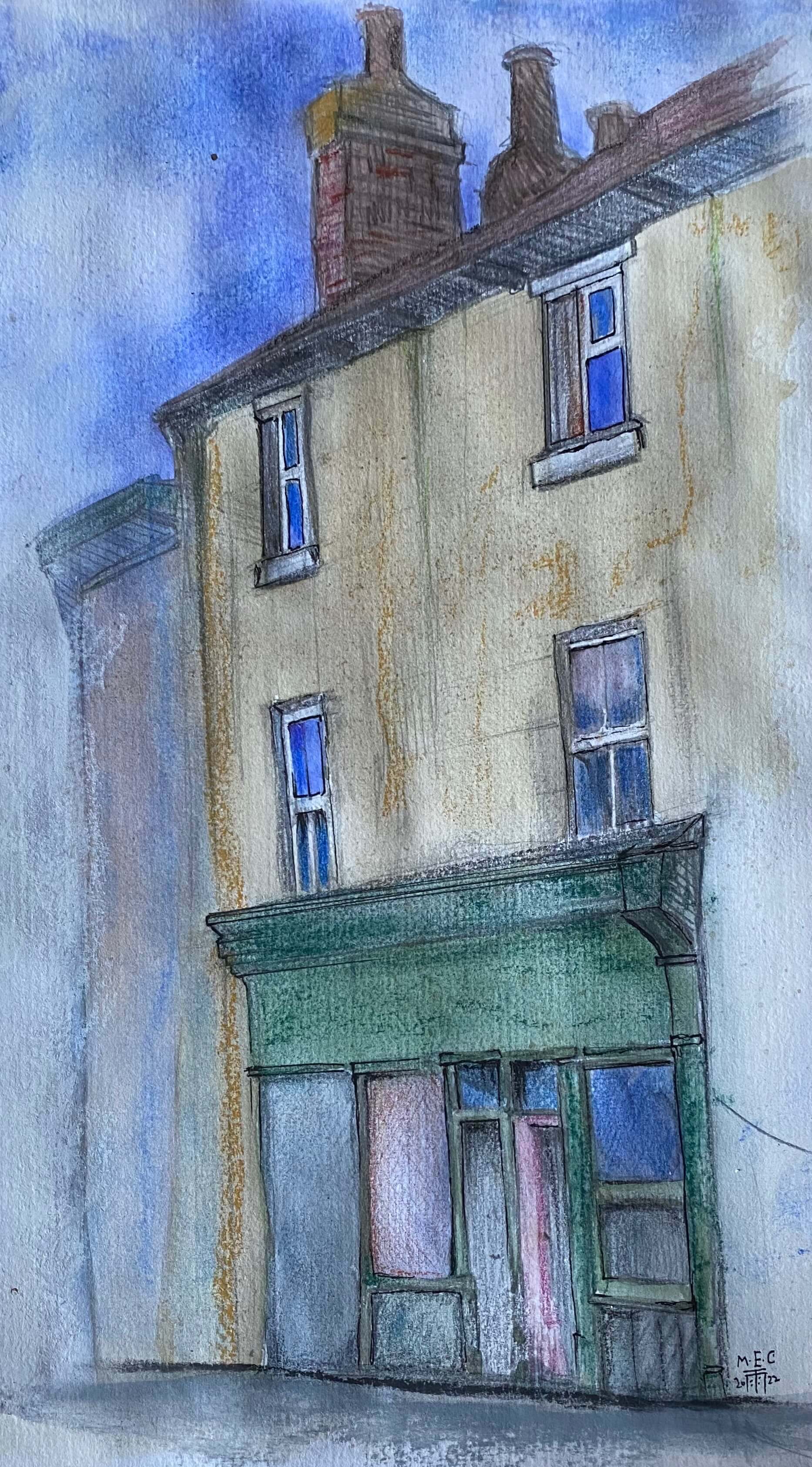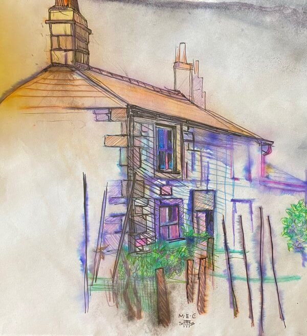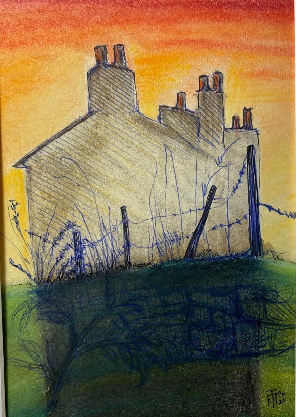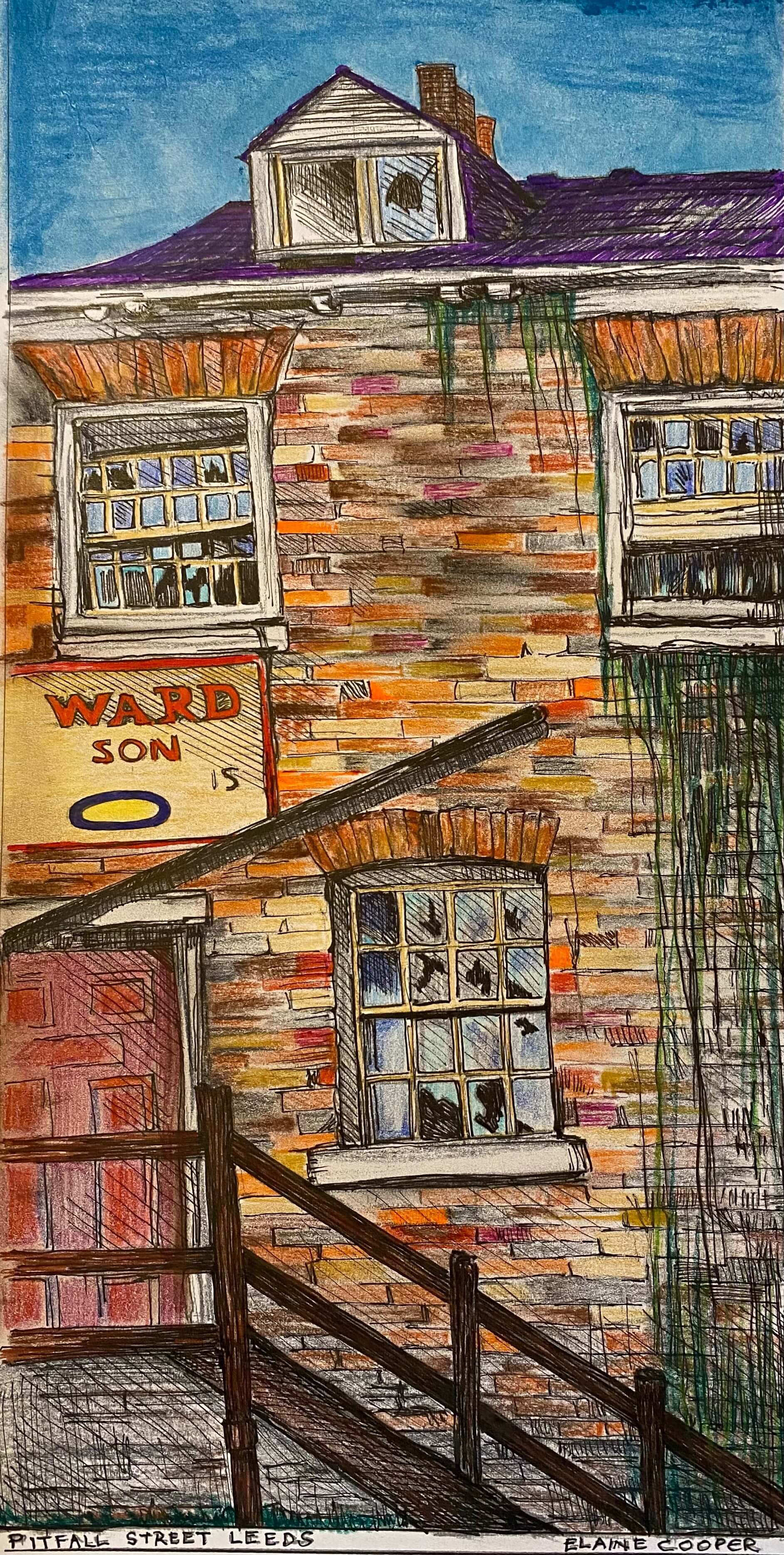 Completed adding colour and other details to old pencils sketches of buildings by Elaine Cooper. Elaine was a Leeds artists who died in 2020 and left me all her work and the contents of her studio, among which were piles of forgotten and discarded pencil drawings. I see these works as post mortem collaborations between Elaine and me, with the aim to bring new life to these images.