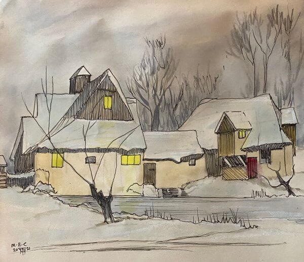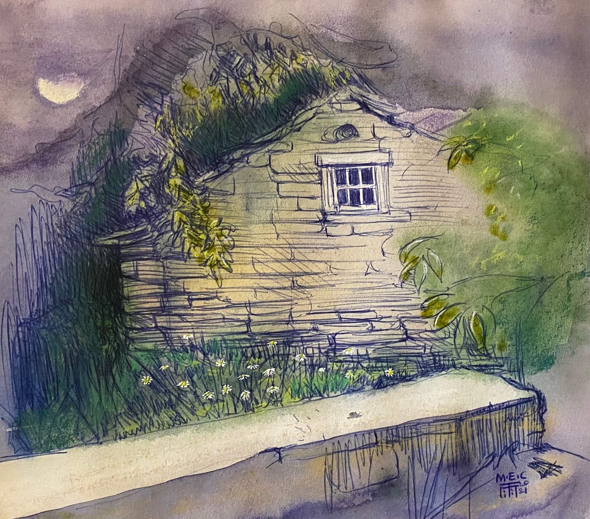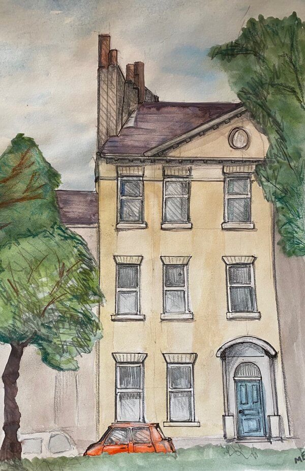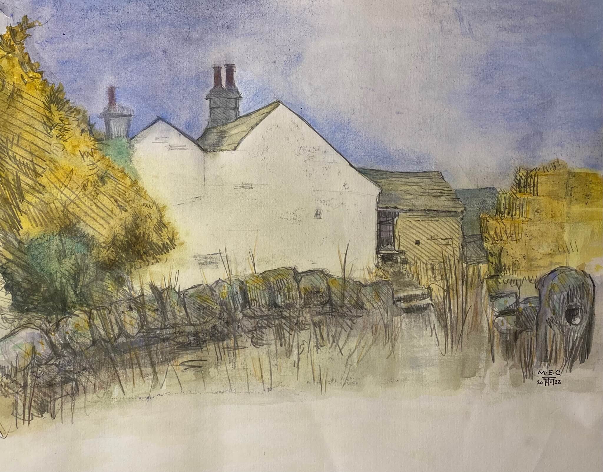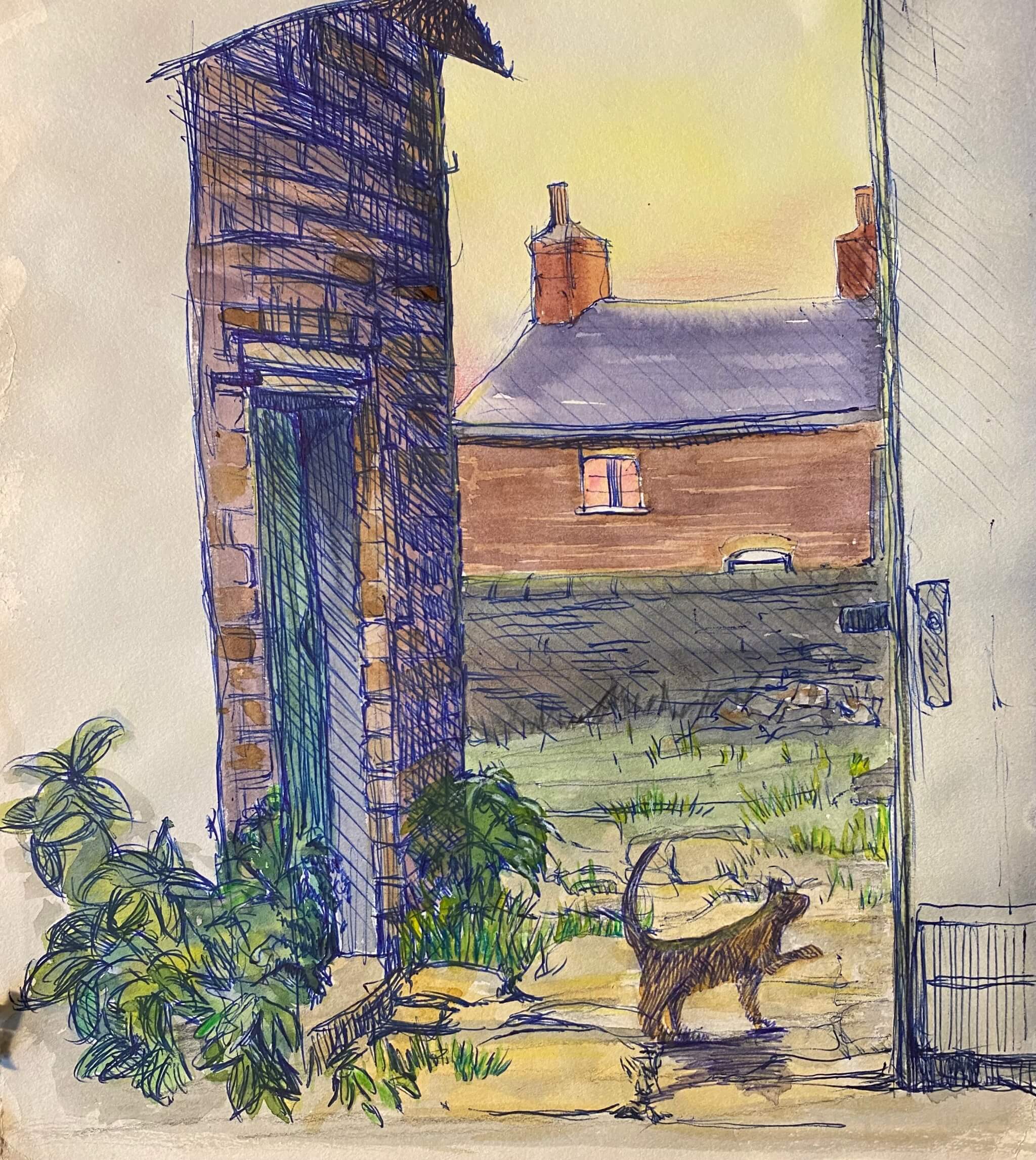 Completed adding colour and other details to old pencils sketches of buildings by Elaine Cooper. Elaine was a Leeds artists who died in 2020 and left me all her work and the contents of her studio, among which were piles of forgotten and discarded pencil drawings. I see these works as post mortem collaborations between Elaine and me, with the aim to bring new life to these images.