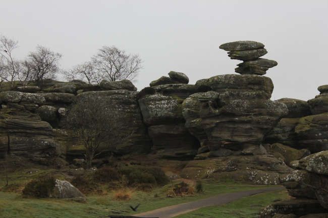 Photo Manipulation derived from a photo taken at Brimham Rocks in March 2022. The original photo (included) was cropped, rotated 90° and mirrored, and extra saturation and exposure brought out the colours of the rock.
