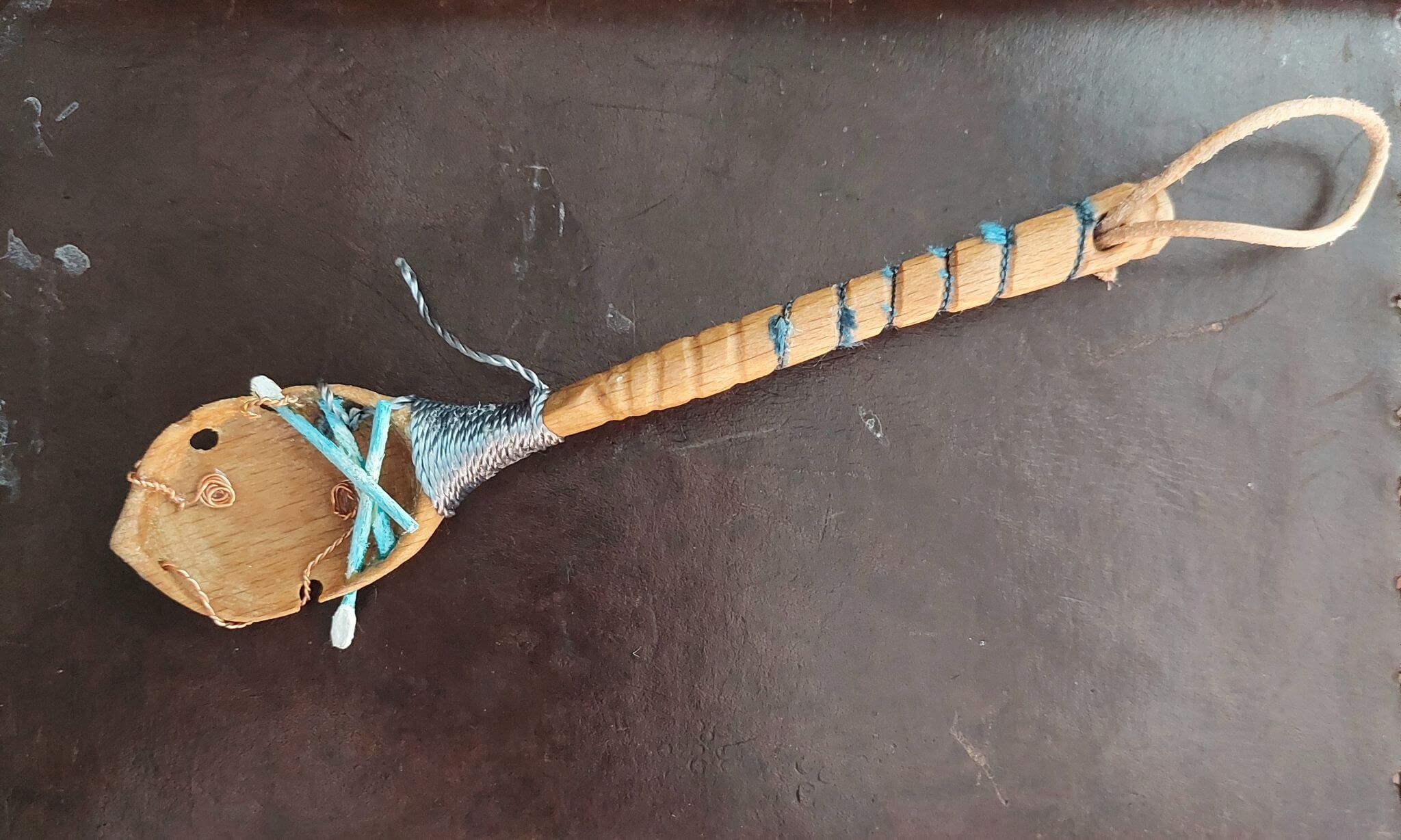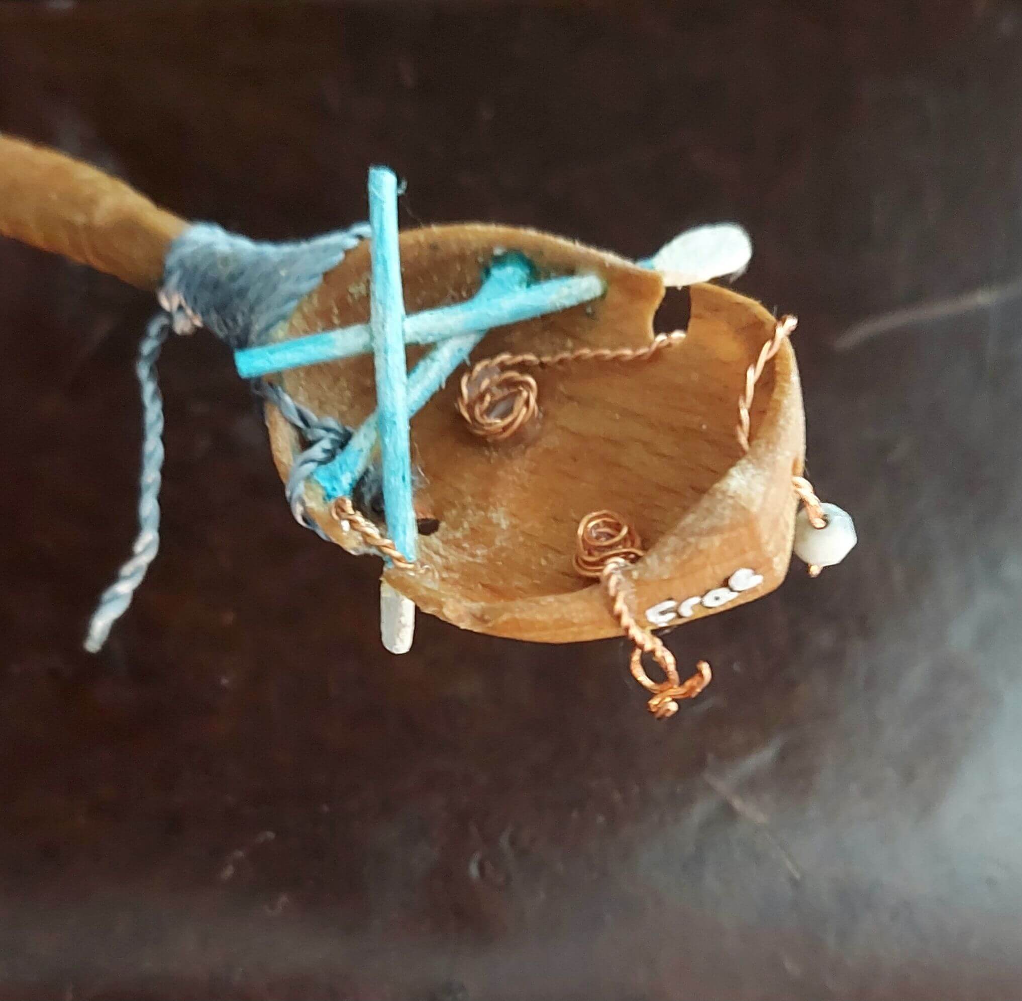 A hand carved wooden spoon sculture, capturing the essence of a rowing boat with anchor, buoy, paddles and textile accents.