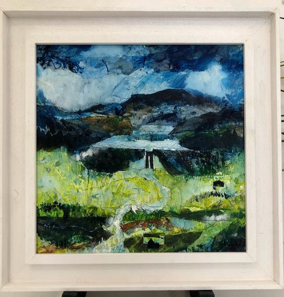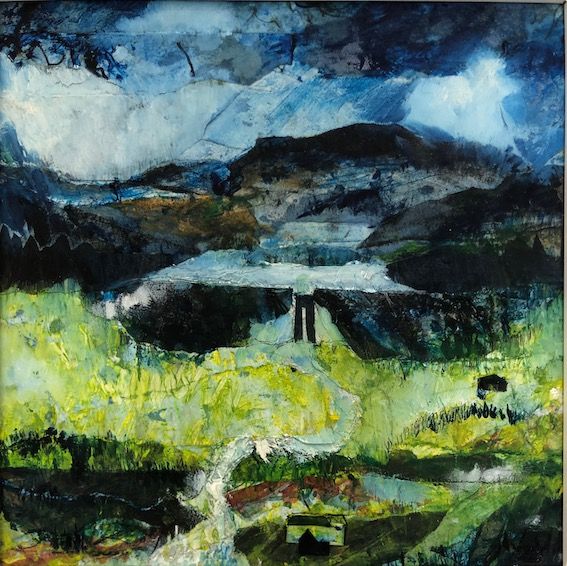 Mixed media abstract collage of Scar House Reservoir from Dale Edge Nidderdale