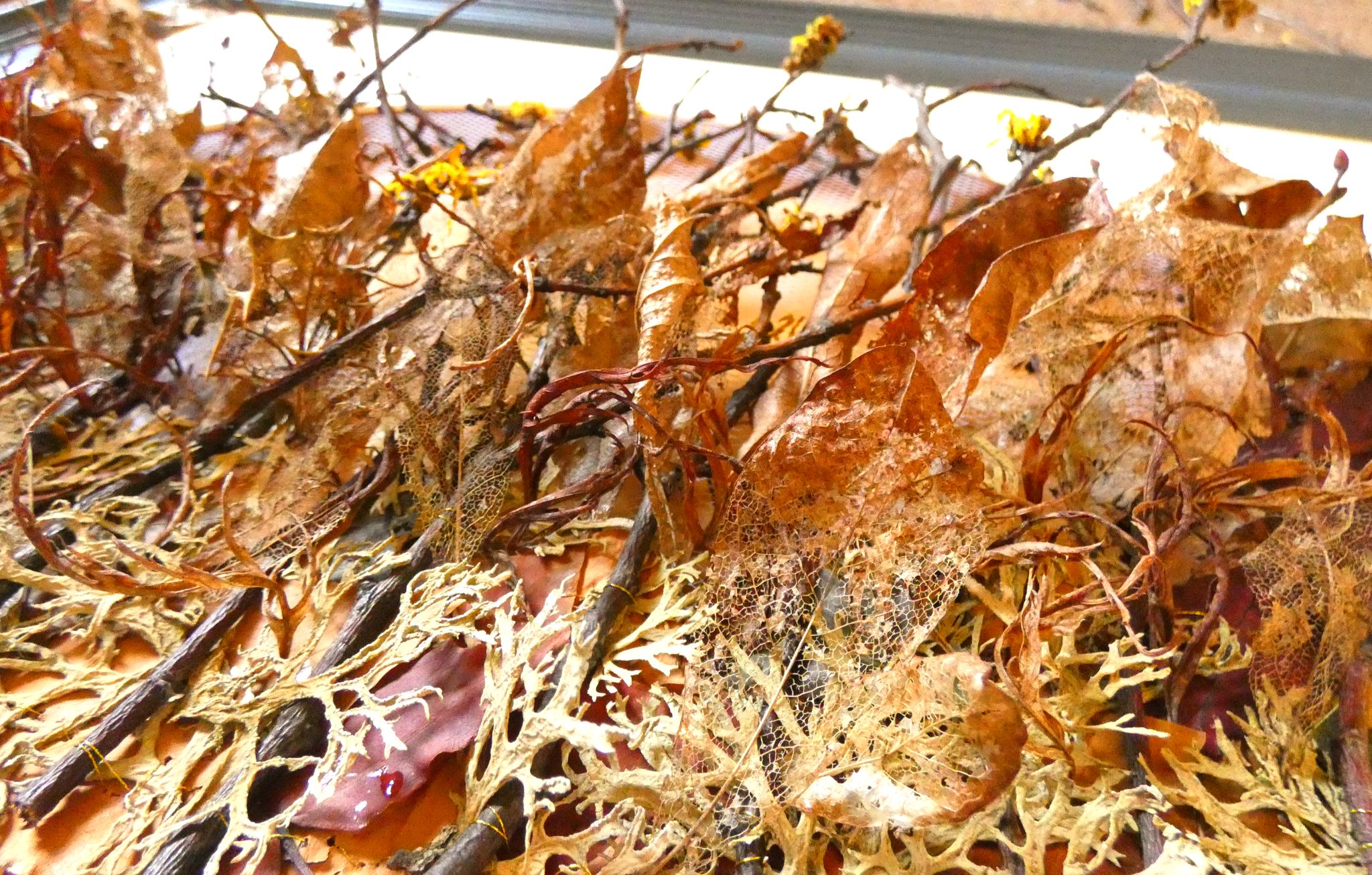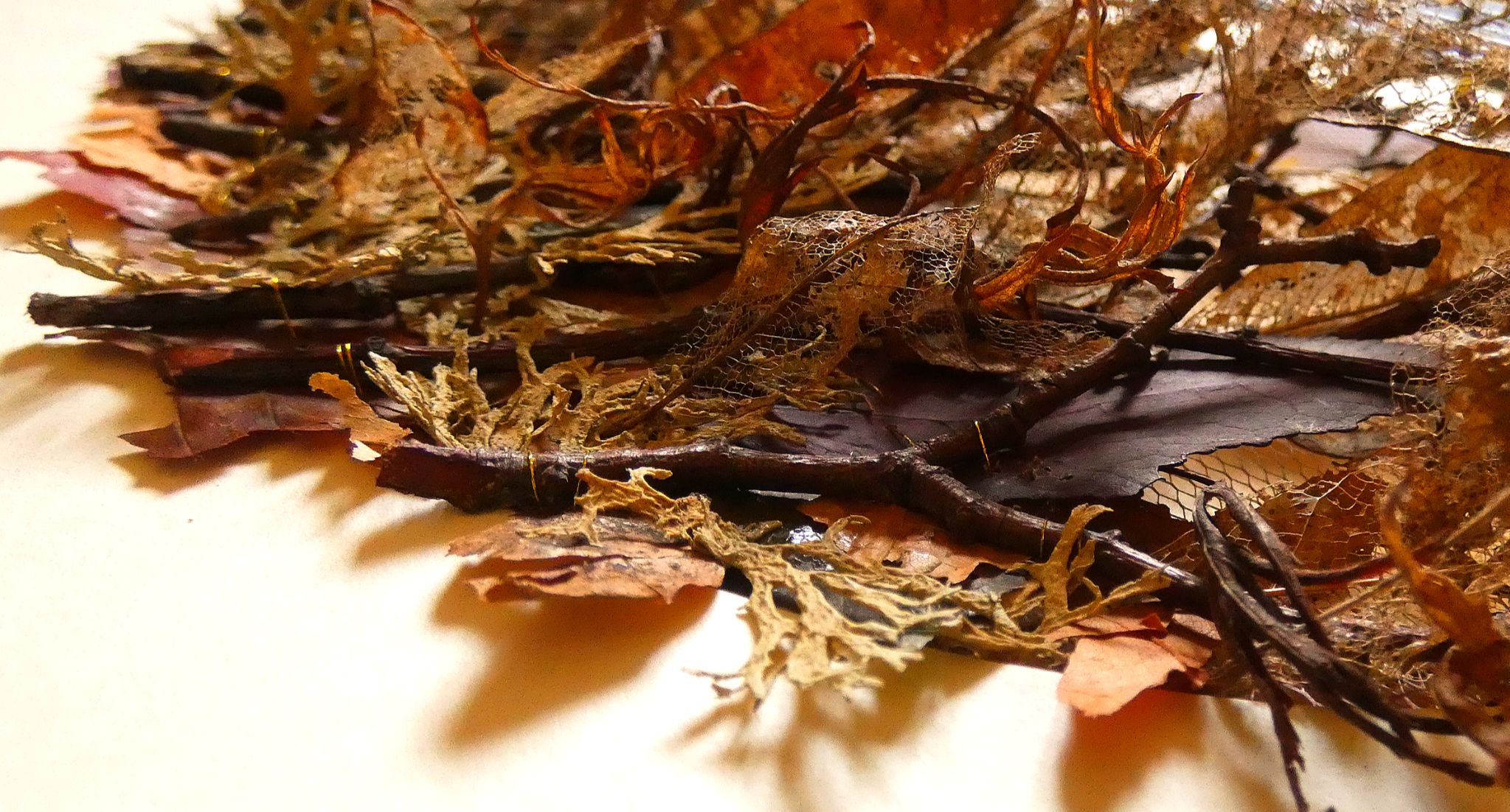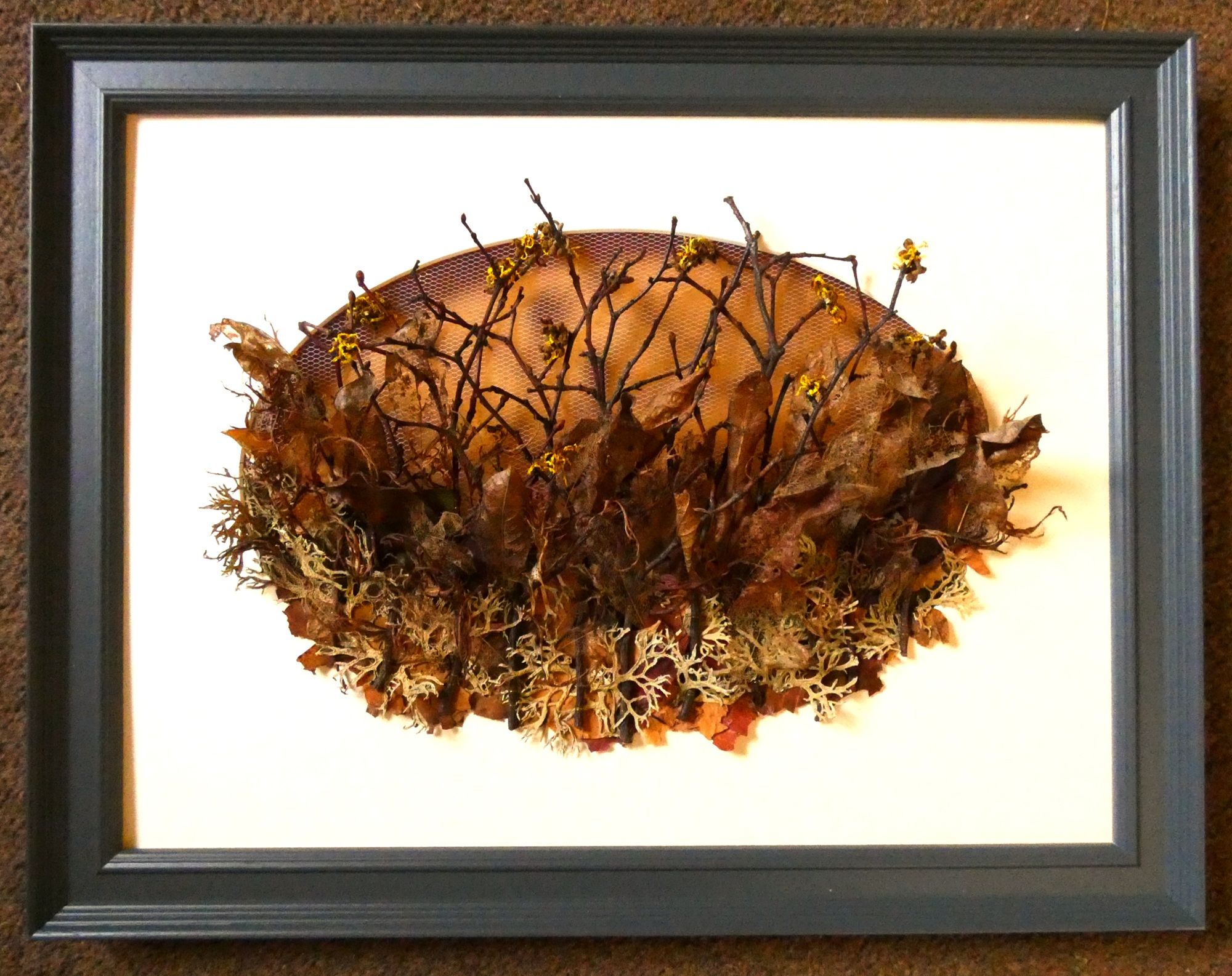 I’ve built up layers of dried leaves and moss amongst bare twigs topped with bright yellow witch hazel flowers to mark the end of a long Winter and the start of Spring. Curling acer leaves mirror the curls of the witch hazel flowers. This piece comes out of the frame, like Spring just waiting to get going as the days grow longer.