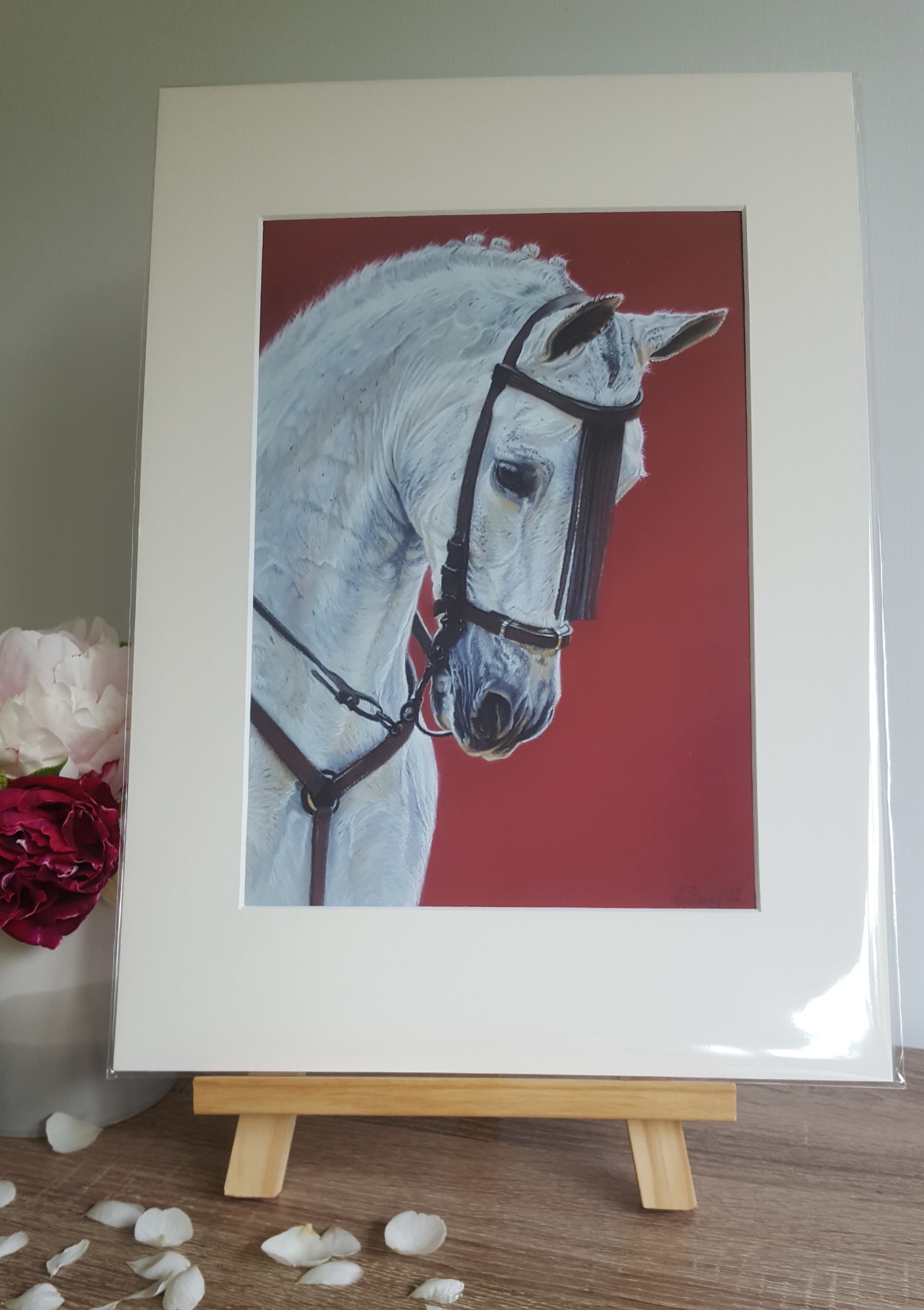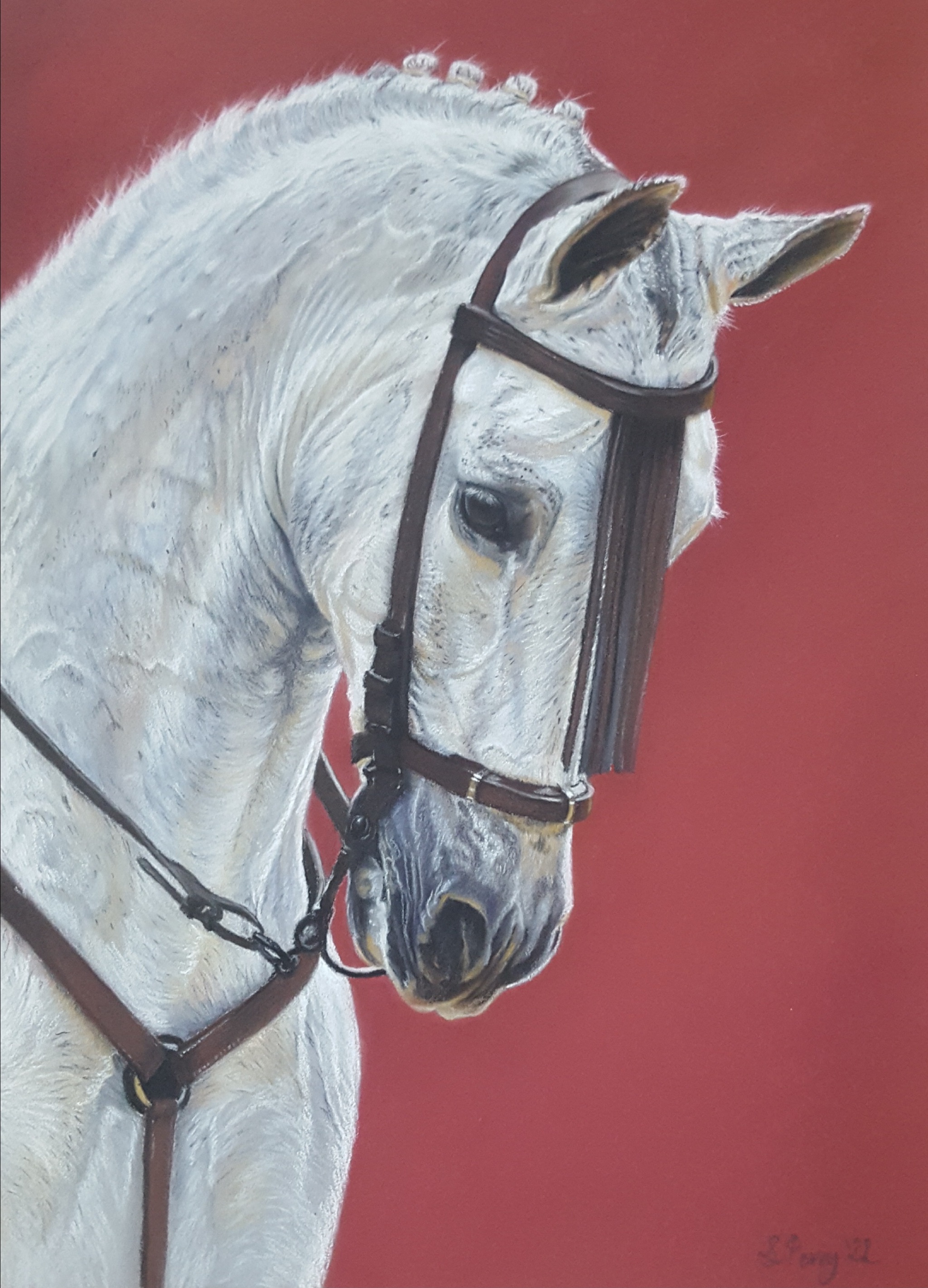 A pastel drawing of an Andalusian horse drawn on Pastelmat wearing a traditional bridle. Mounted in black and framed in a black wooden frame behind Tru Vue Ultra Vue glass.
