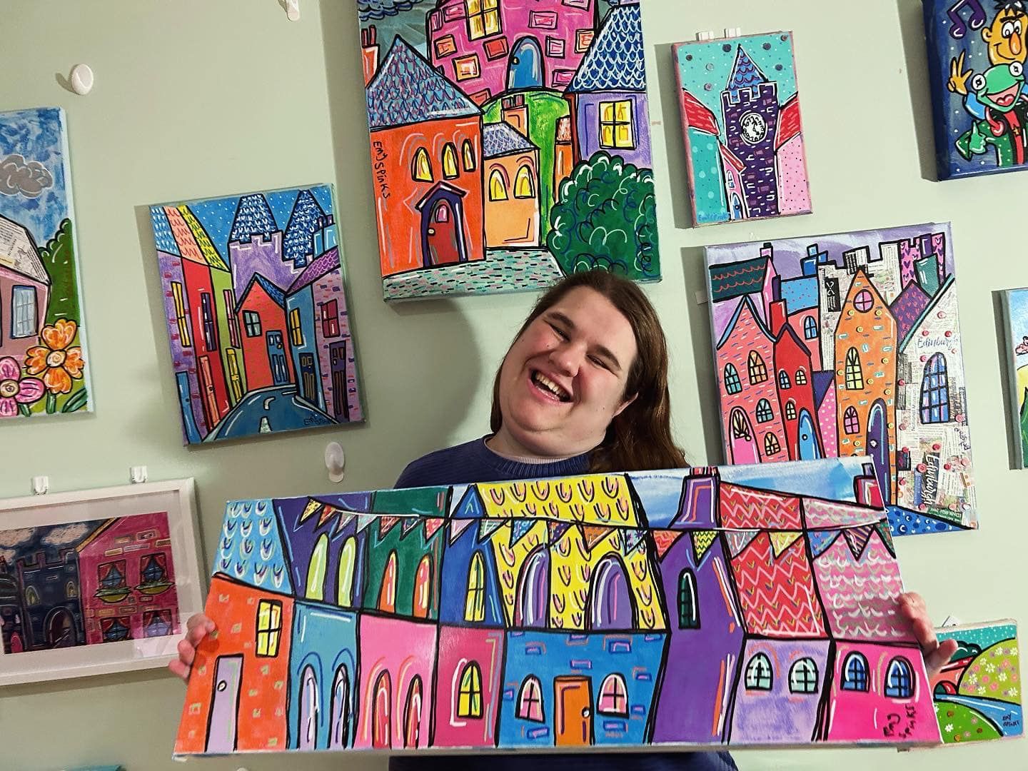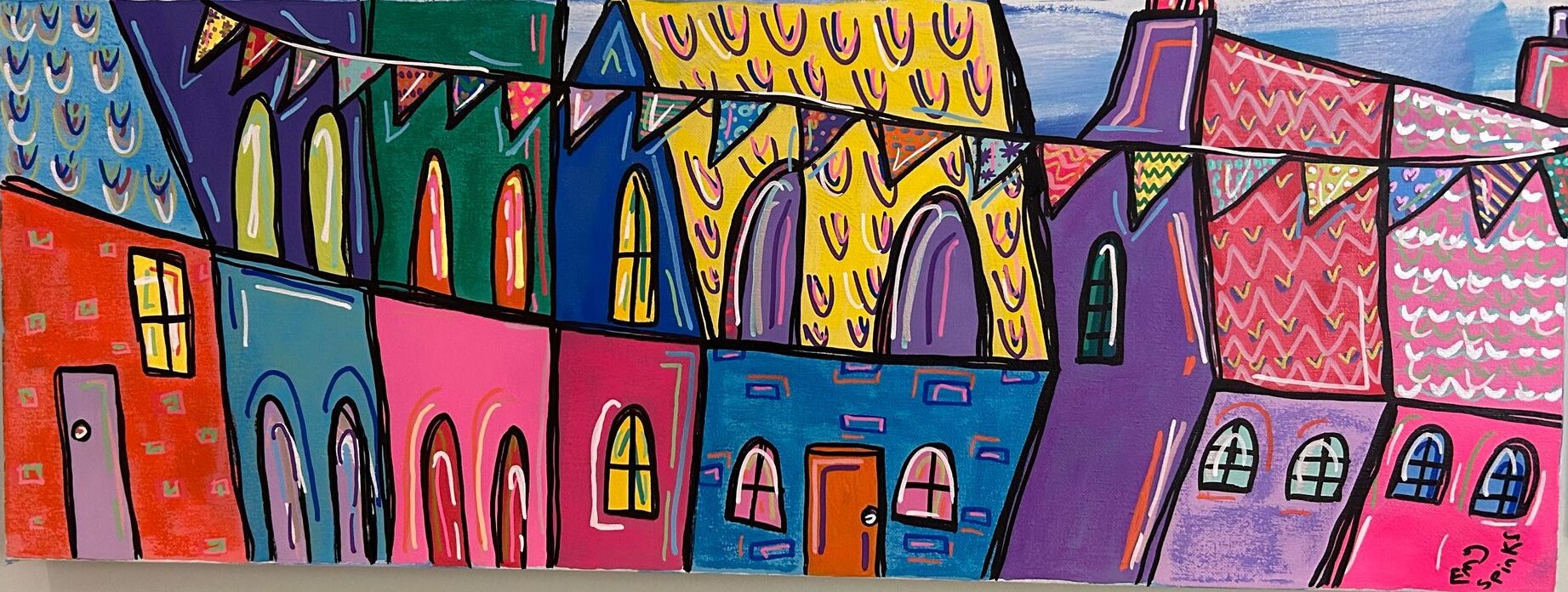 After a trip to Edinburgh Emy created this colourful abstract depiction of the famous Victoria Street in her own style.