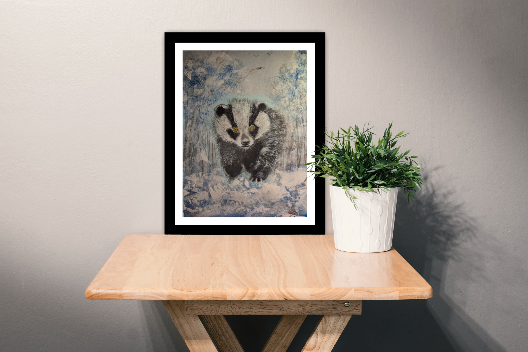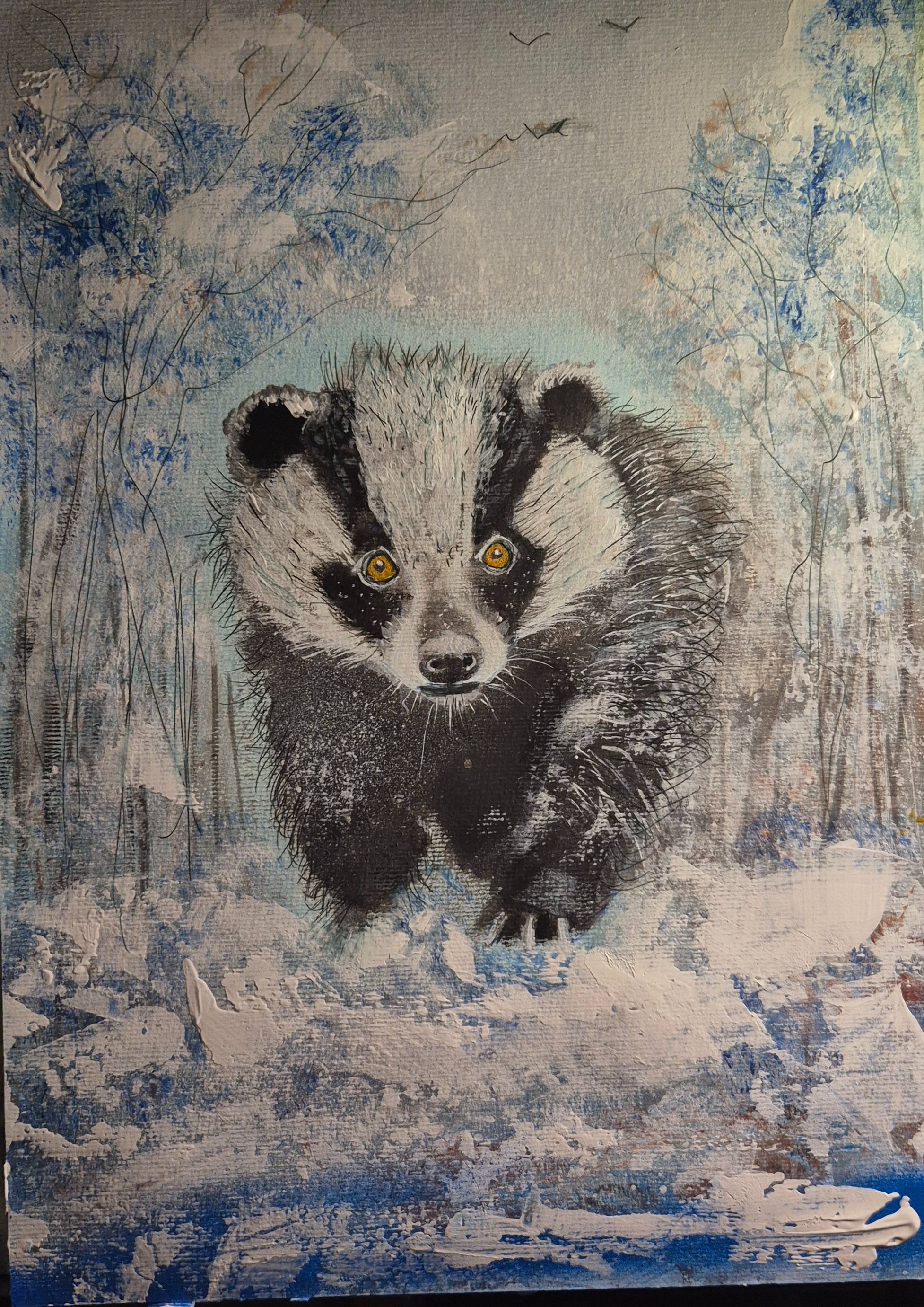 In this enchanting painting, a badger gracefully traverses a snowy landscape, its fur a striking contrast against the wintry backdrop. The badger’s eyes, bright and curious, seem to capture the warmth and spirit of this serene moment. The snow-laden ground and delicately frosted trees frame its determined stride, as if inviting the viewer into a calm, quiet world. Soft hues of blue and white blend seamlessly, evoking a sense of peaceful solitude in the crisp winter air. The scene is both tranquil and alive, a perfect depiction of nature’s gentle beauty.